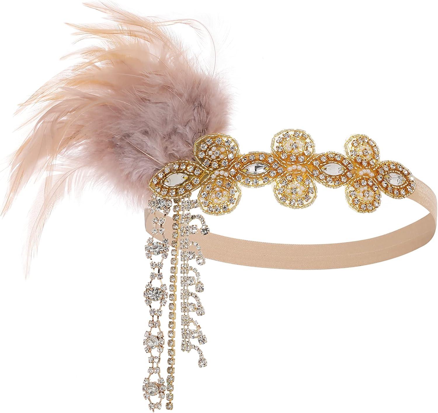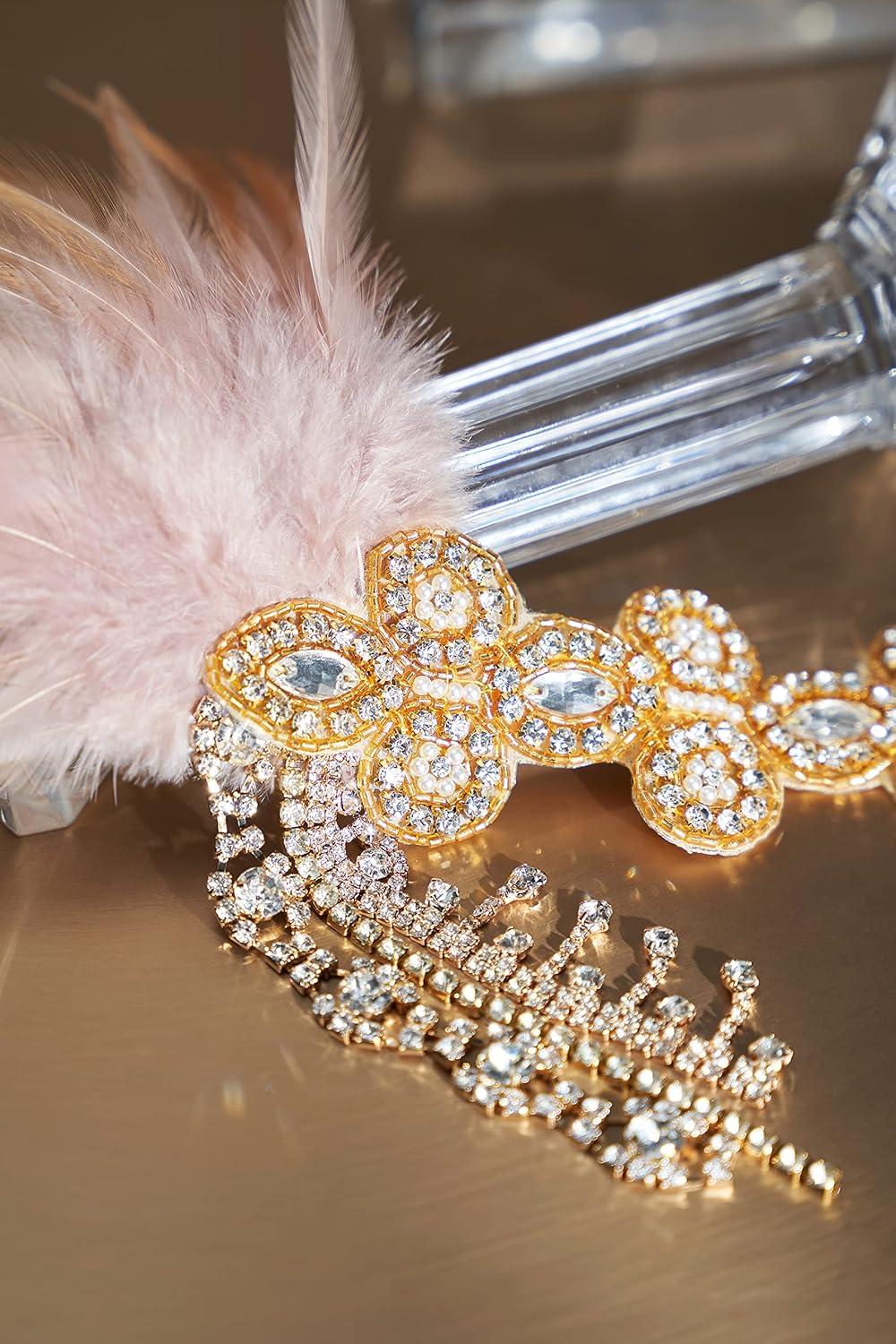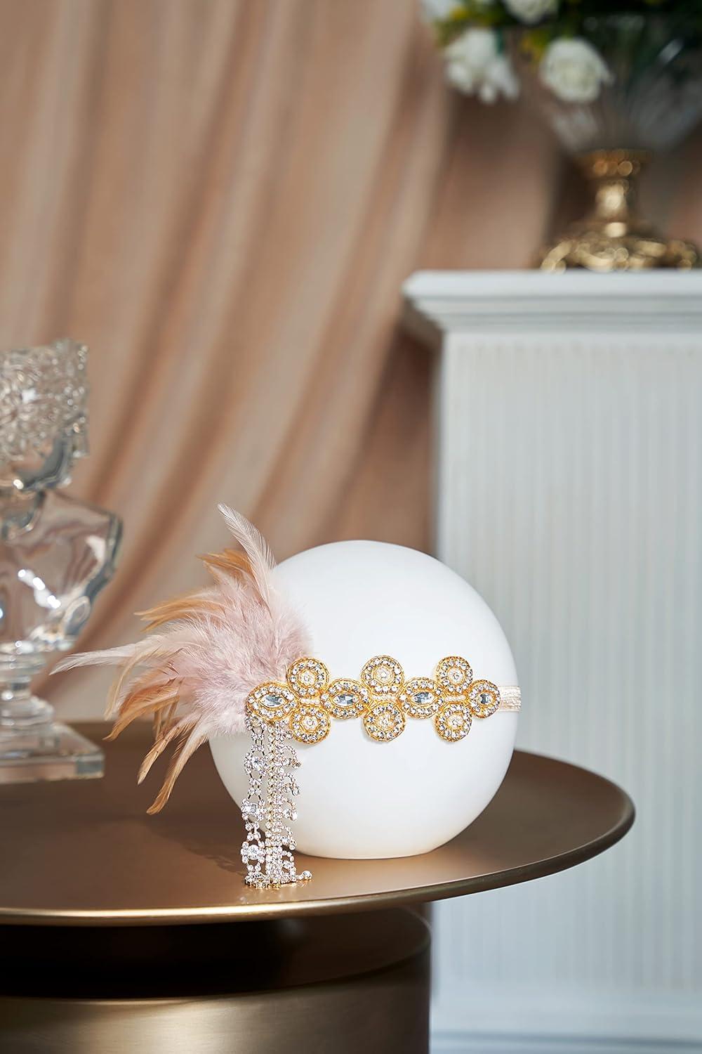 BABAEYOND 1920s Headpiece Flapper Headband – Feather Crystal Headpiece Flapper Accessories(Gold Champagne)