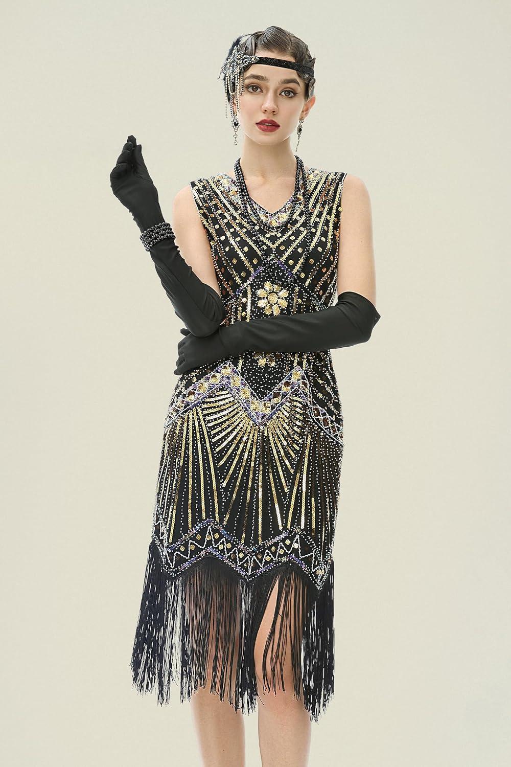 imageBABEYOND 1920s Accessories for Women  Flapper Feather Headband Headpiece for Women Pearl Bracelet Necklace GlovesBlack Gold