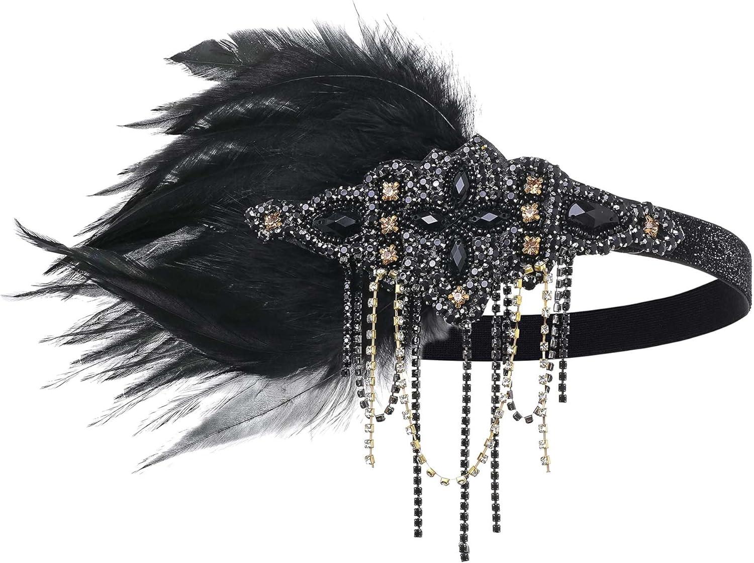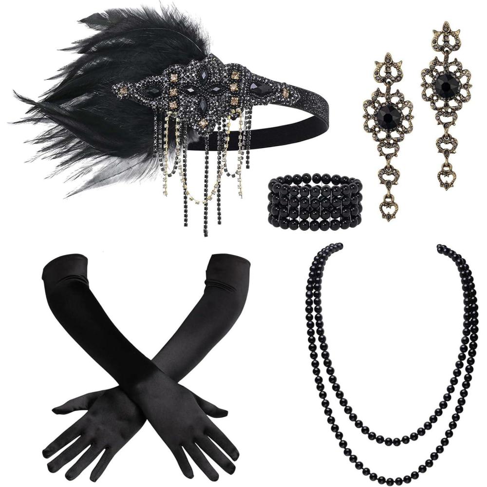 BABEYOND 1920s Accessories for Women – Flapper Feather Headband Headpiece for Women Pearl Bracelet Necklace Gloves(Black Gold)