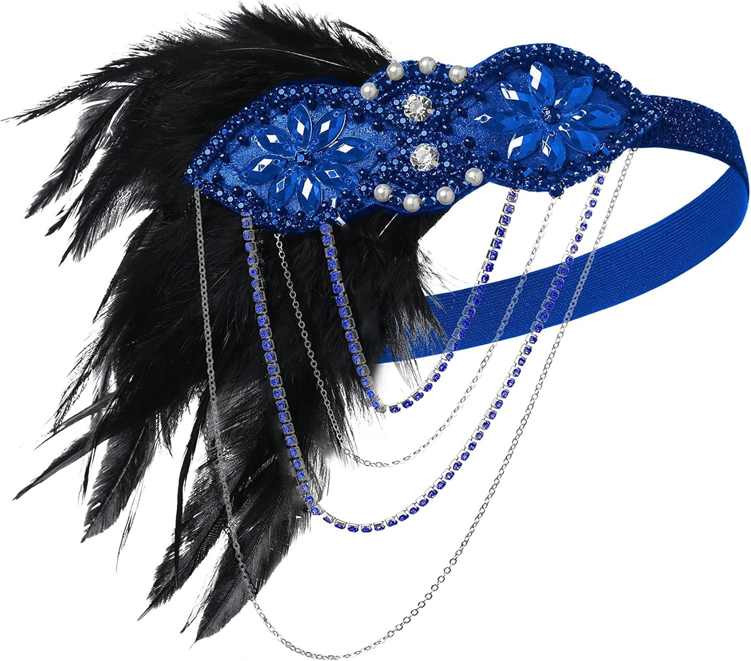 BABEYOND 1920s Accessories for Women – Flapper Headpiece Feather Great Gatsby Accessories for Women Pearl Necklace Gloves(Blue)