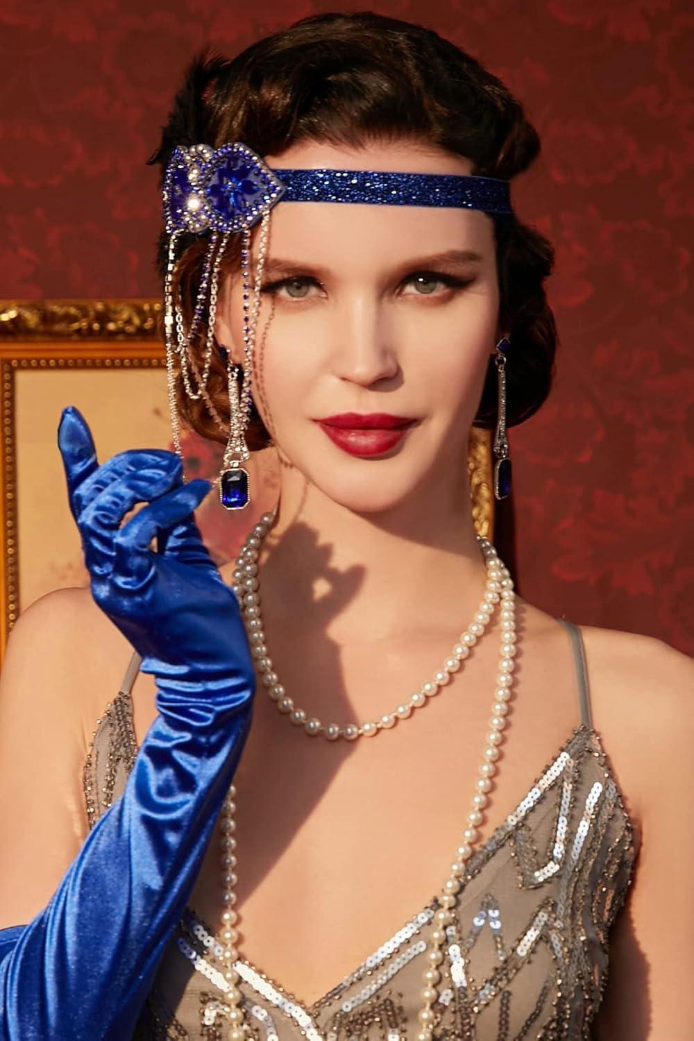 BABEYOND 1920s Accessories for Women - Flapper Headpiece Feather Great Gatsby Accessories for Women Pearl Necklace Gloves(Blue)