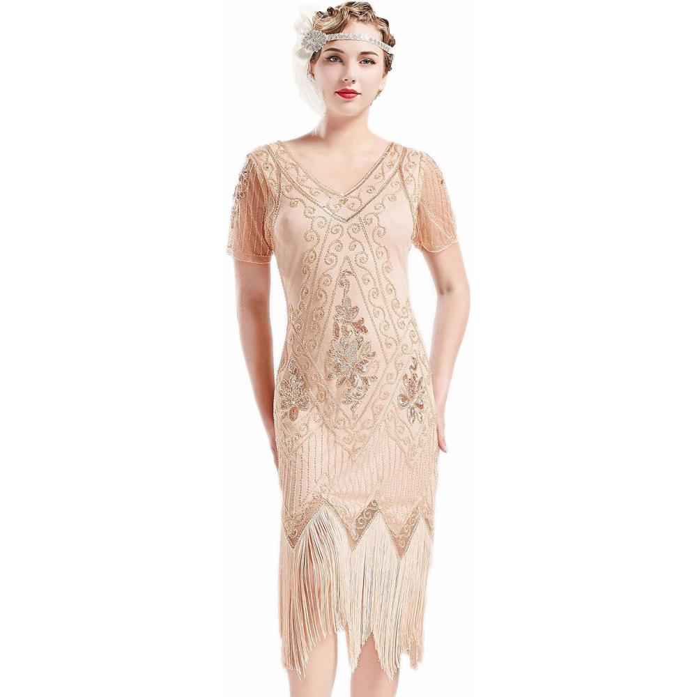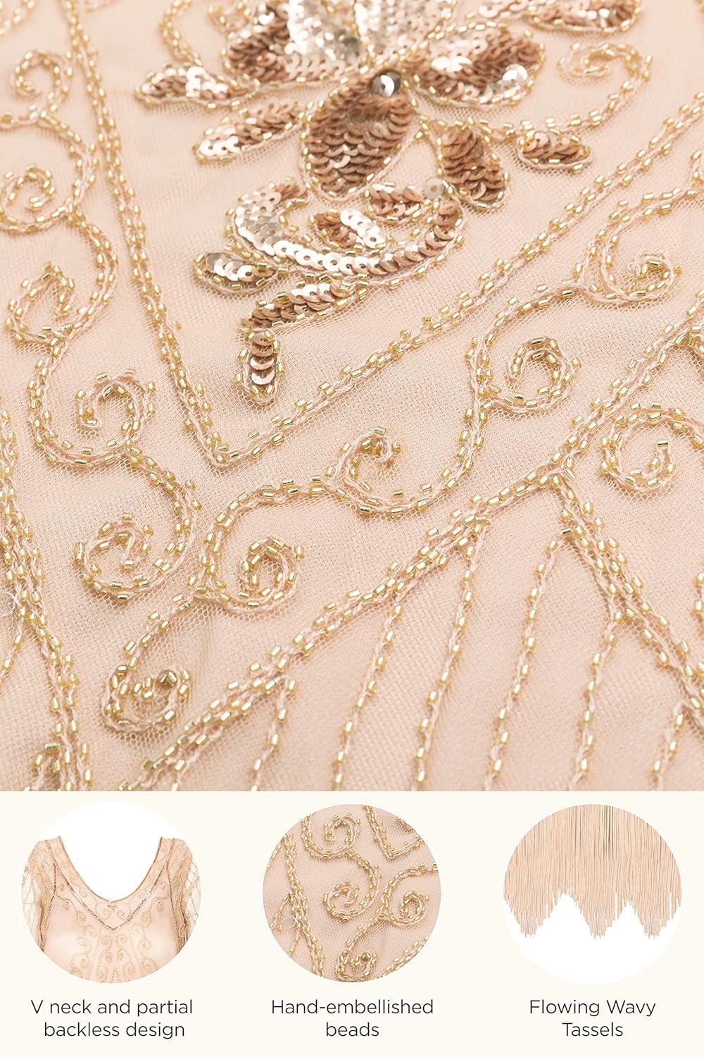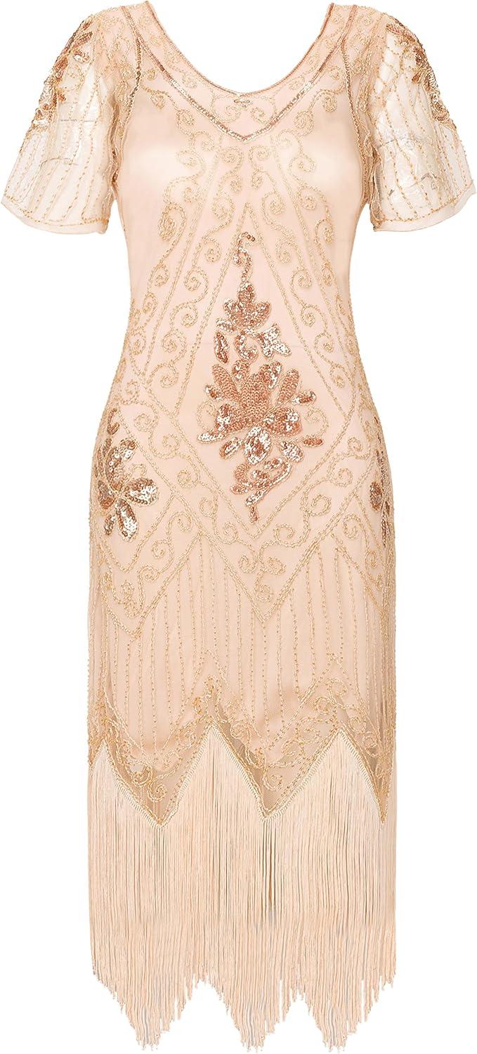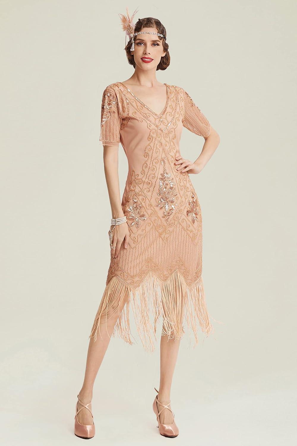 BABEYOND 1920s Art Deco Fringed Sequin Dress Roaring 20s Flapper Fancy Dress(Apricot)