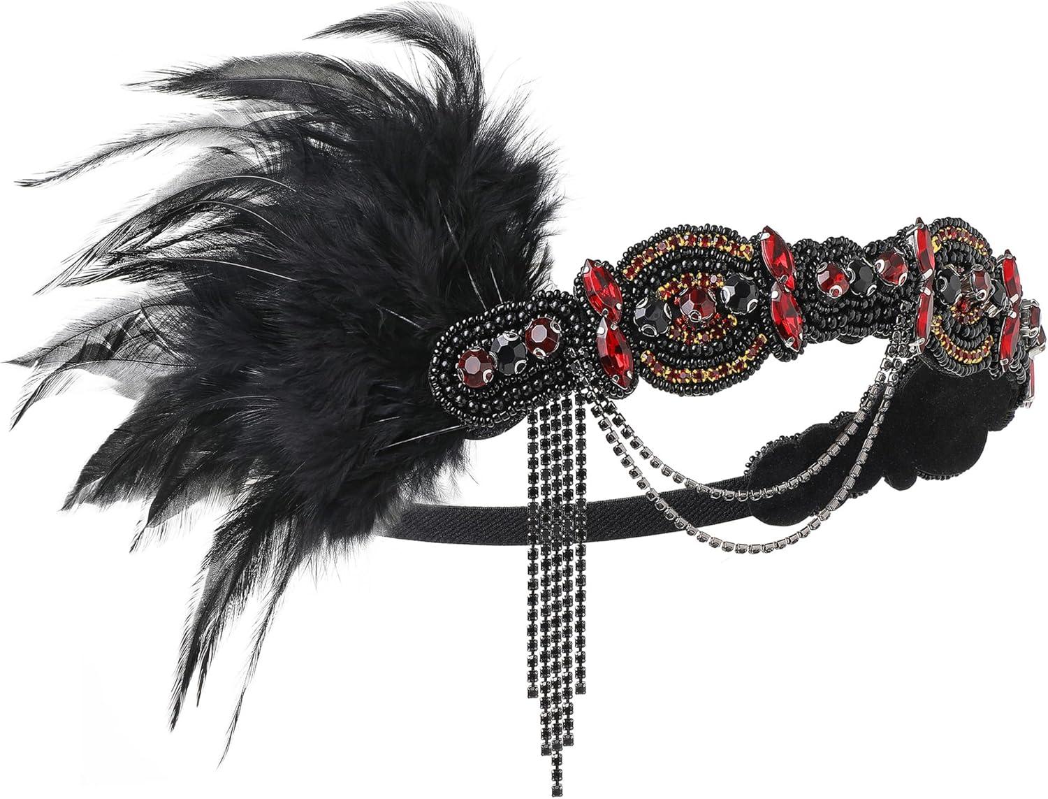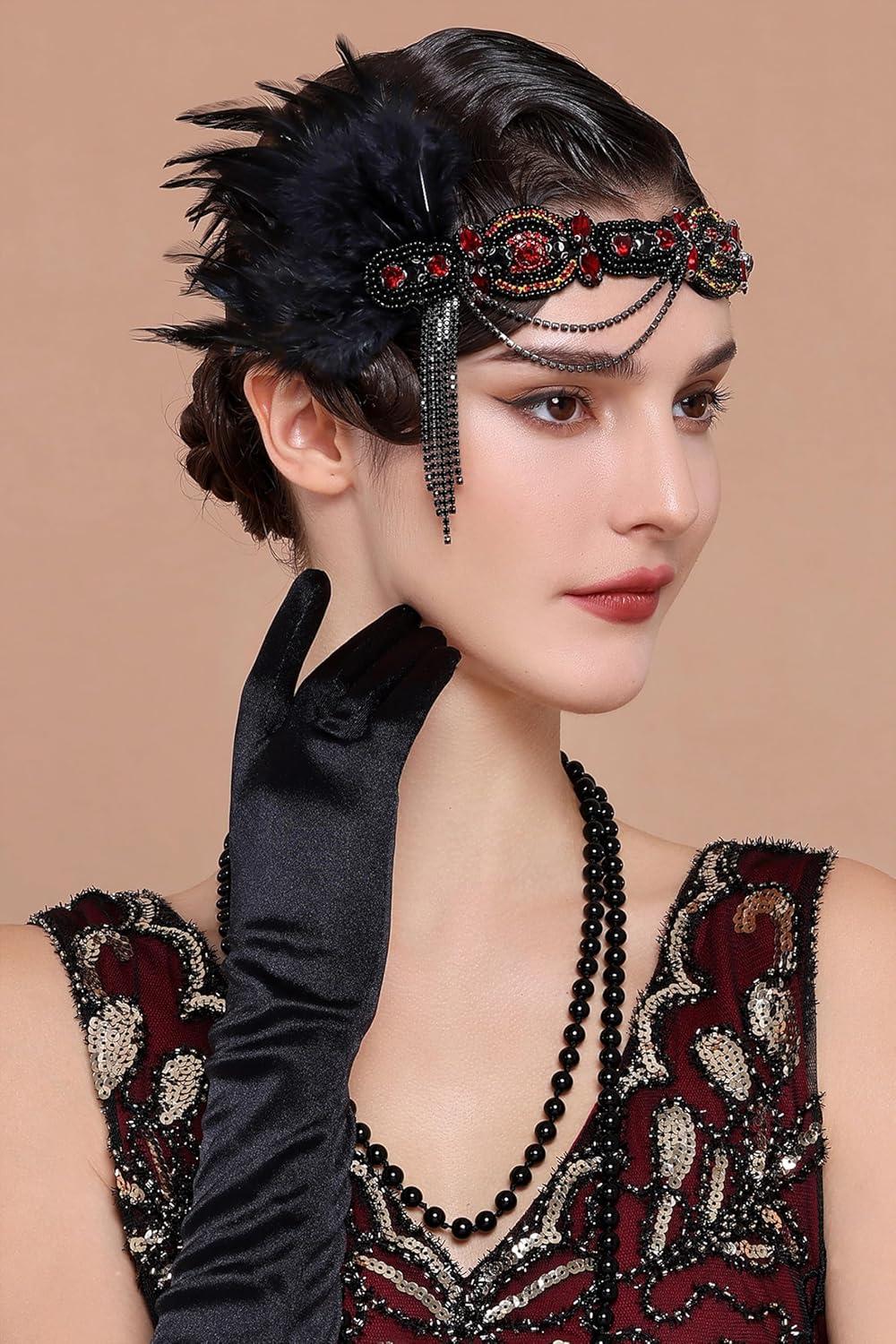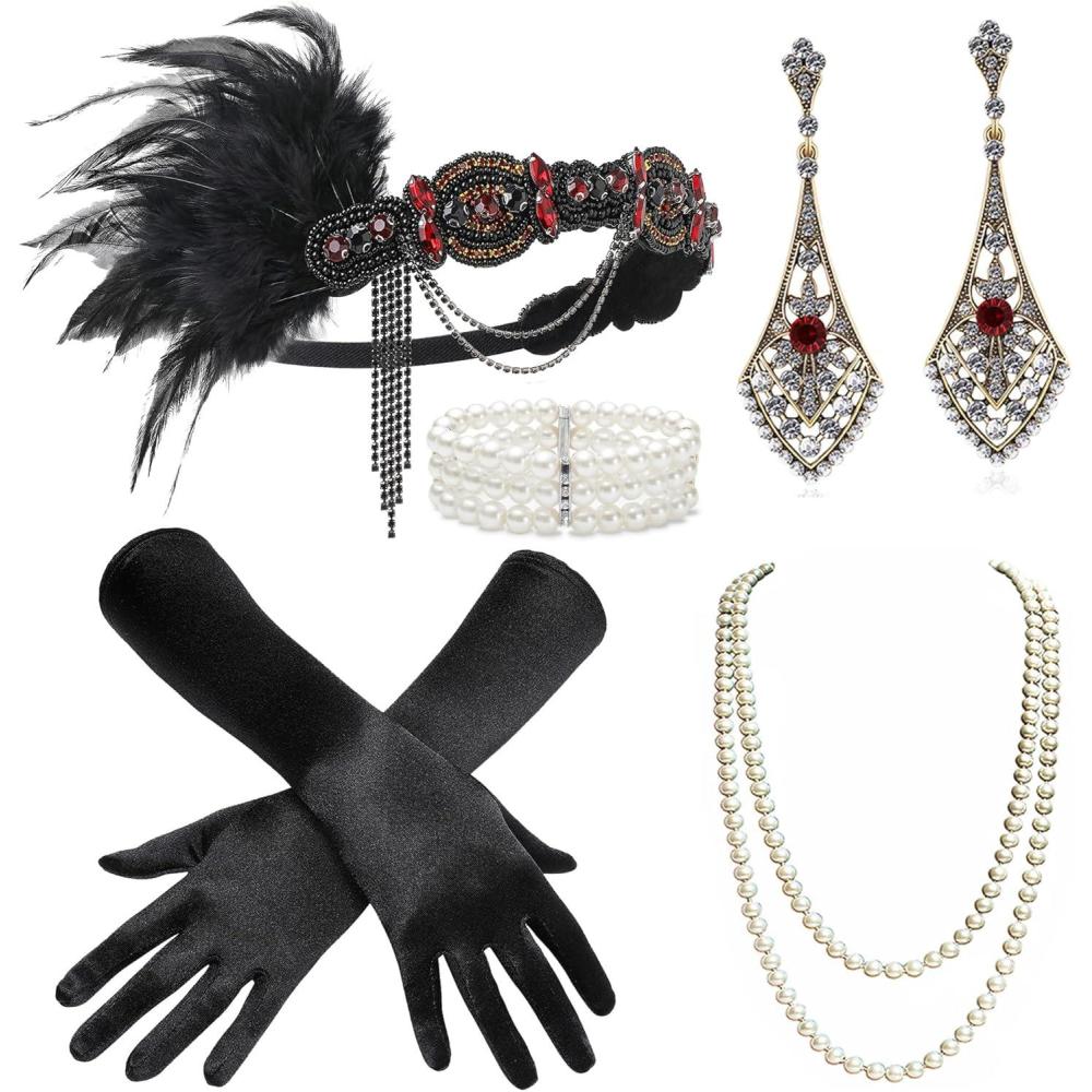 BABEYOND 1920s Accessories for Women – Flapper Feather Headband Headpiece for Women 20s Pearl Bracelet Necklace Gloves(Black)