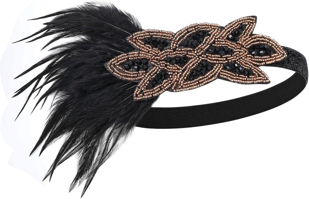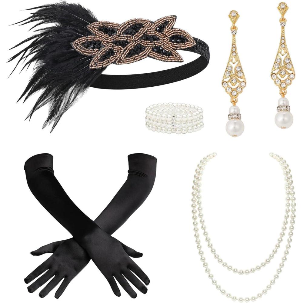 BABEYOND 1920s Flapper Accessories Great Gatsby Costume Accessories 20s Flapper Headband Pearl Necklace Gloves Plastic Holder(Gold Black)