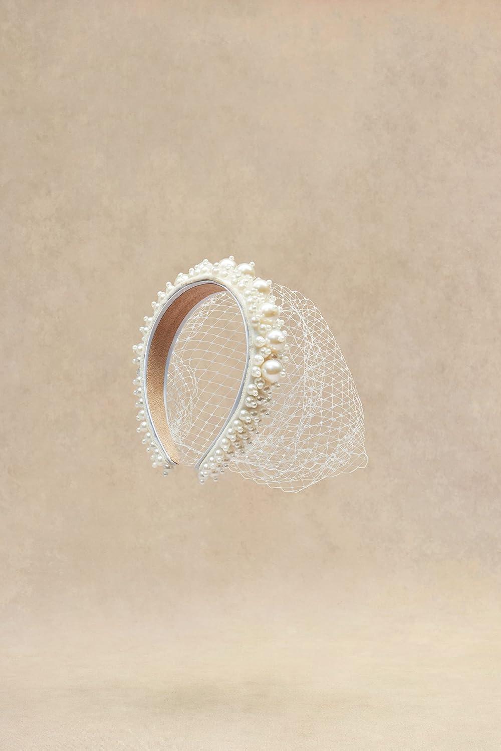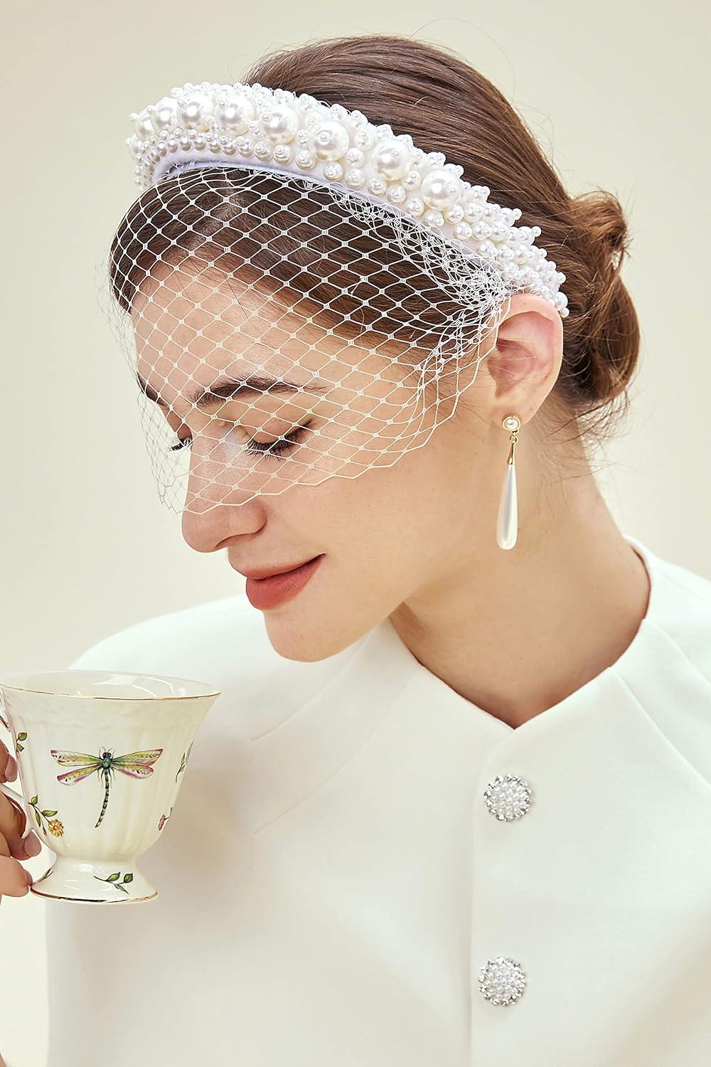 BABEYOND 1920s Flapper Fascinator Mesh Pearl Veil Headband Bridal Wedding Tea Party Fascinator Veil for Women(White With Pearl)