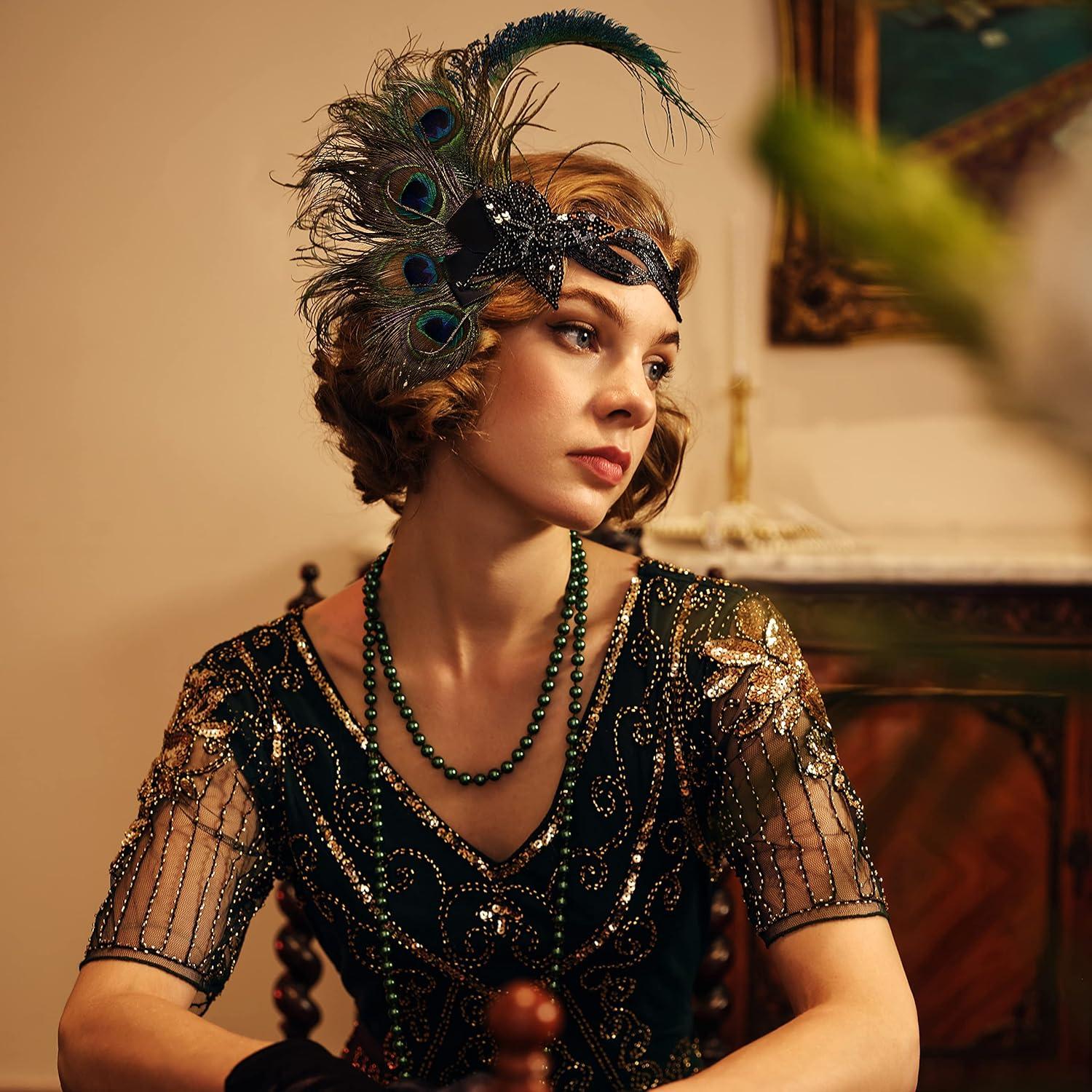 BABEYOND 1920s Flapper Headband Peacock Feather Headpiece Gatsby Accessories for Women Sequined Showgirl Headpiece