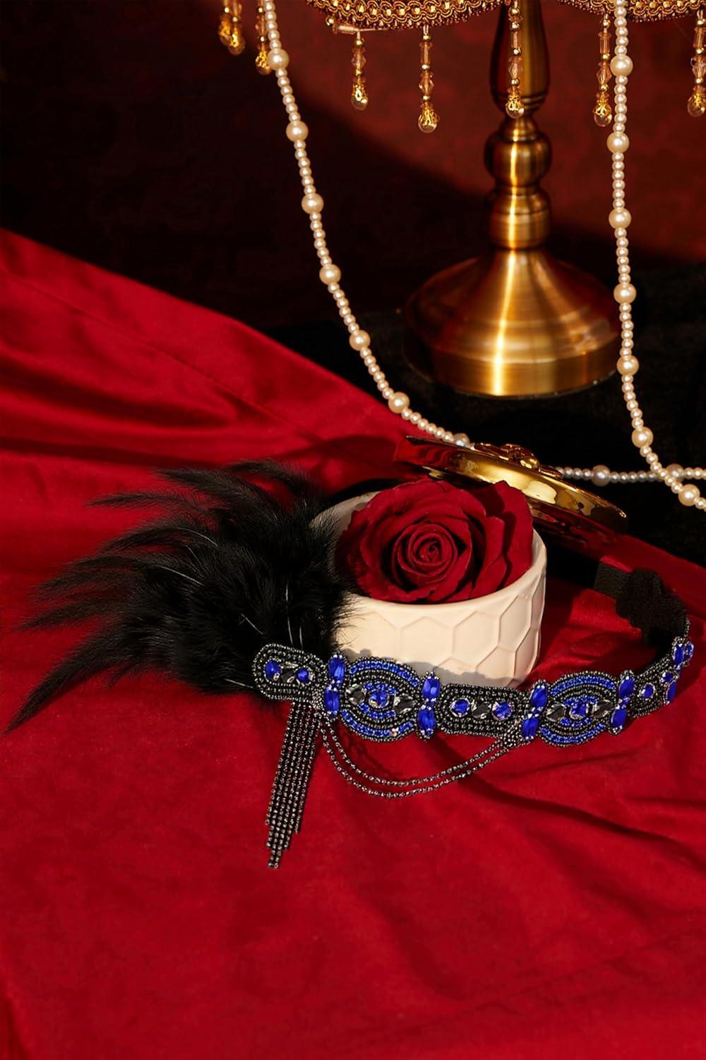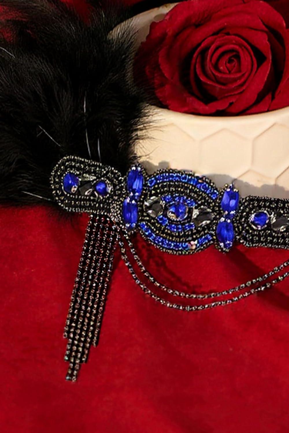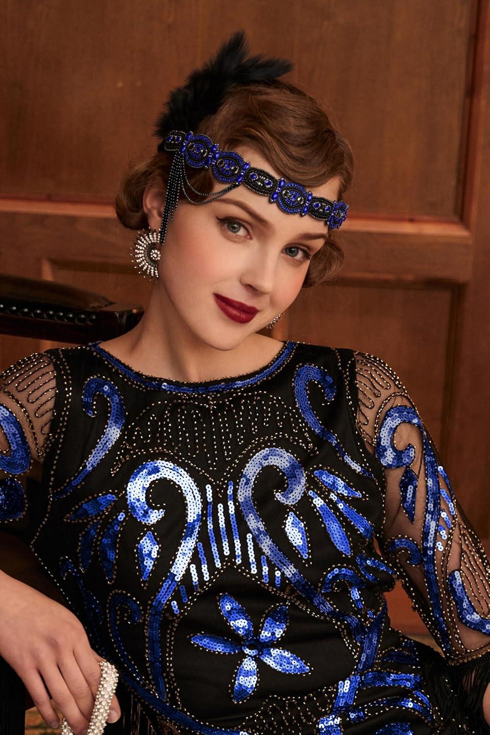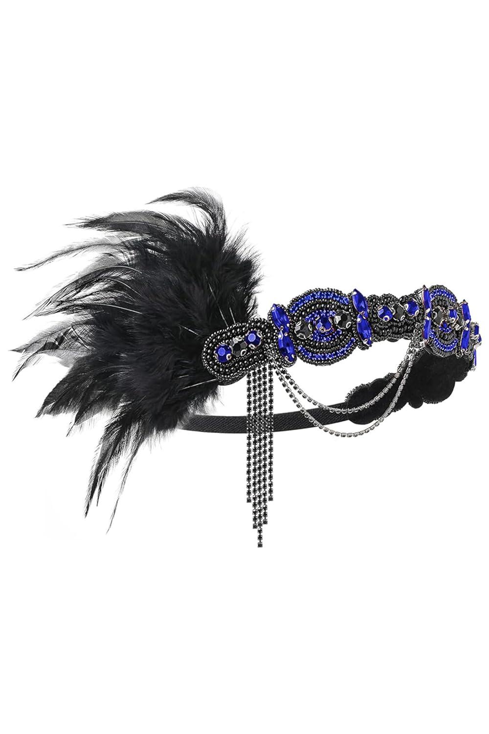 BABEYOND 1920s Flapper Headband Roaring 20s Gatsby Headpiece Black Feather Headband 1920s Flapper Hair Accessories (Gold)(Blue)