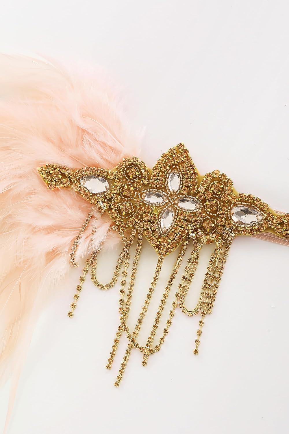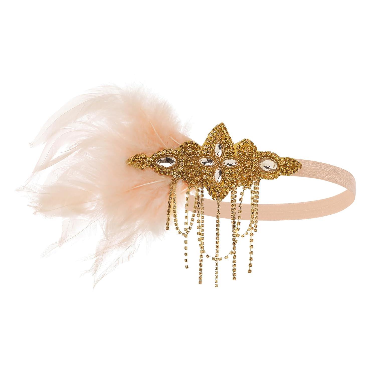 BABEYOND 1920s Flapper Headpiece 20s Gatsby Black Feather Headband Roaring 20s Hair Accessories with Crystal Beads (Black Gold)(Champagne)