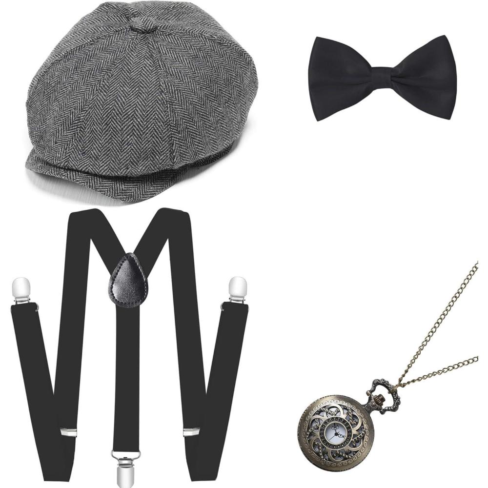 BABEYOND 1920s Mens Gatsby Gangster Costume Accessories Set 30s Manhattan Fedora Hat Bow Tie Suspenders(Set-12)