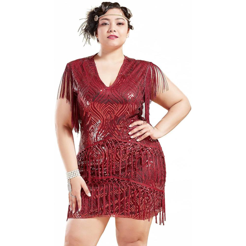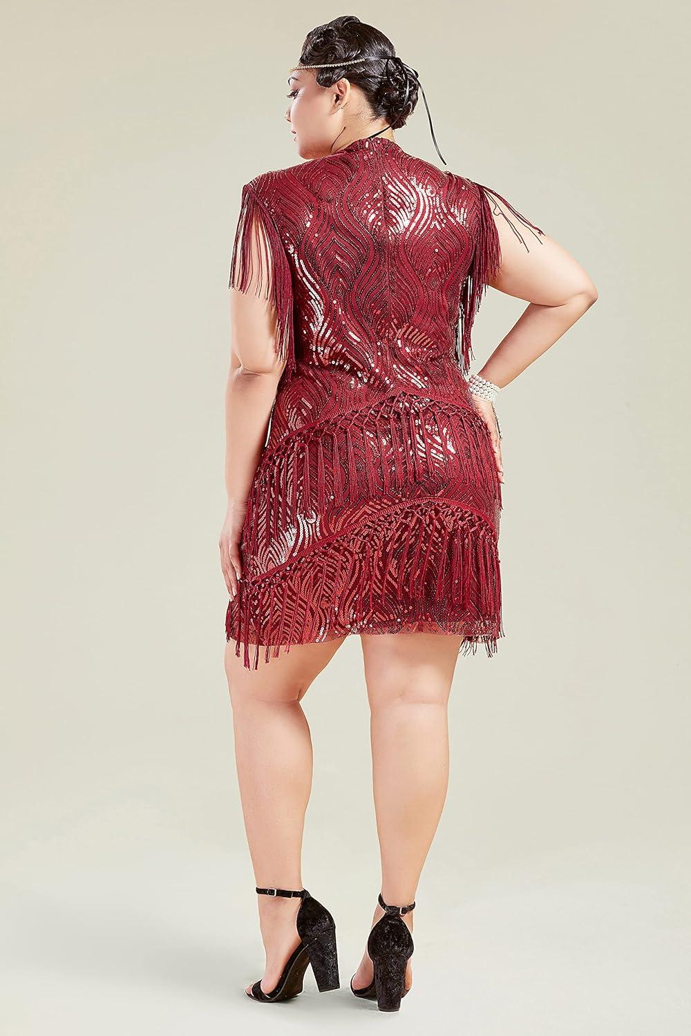 BABEYOND 1920s Plus Size Flapper Dress Long Fringed Gatsby Dress Plus Sequins Beaded Vintage Dress(Wine Red)