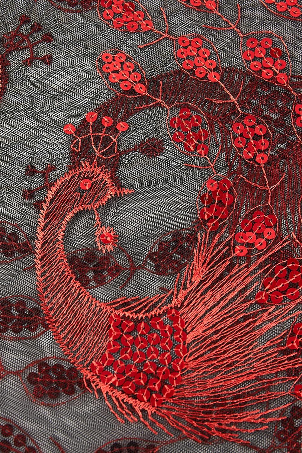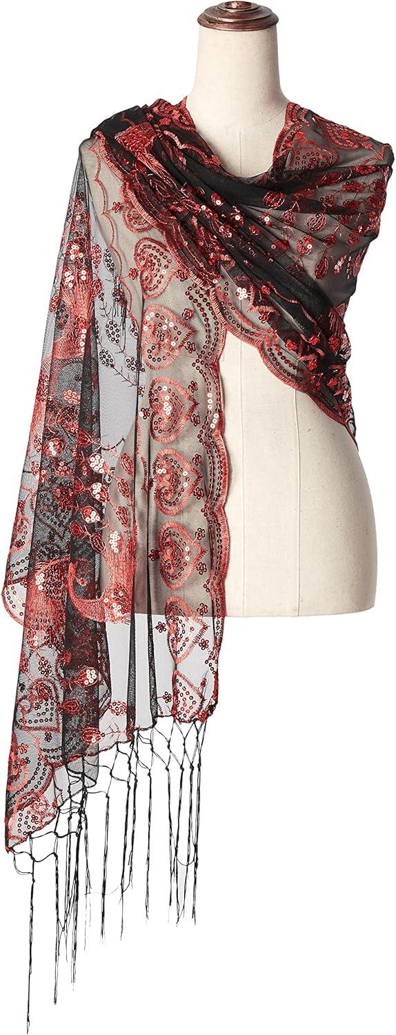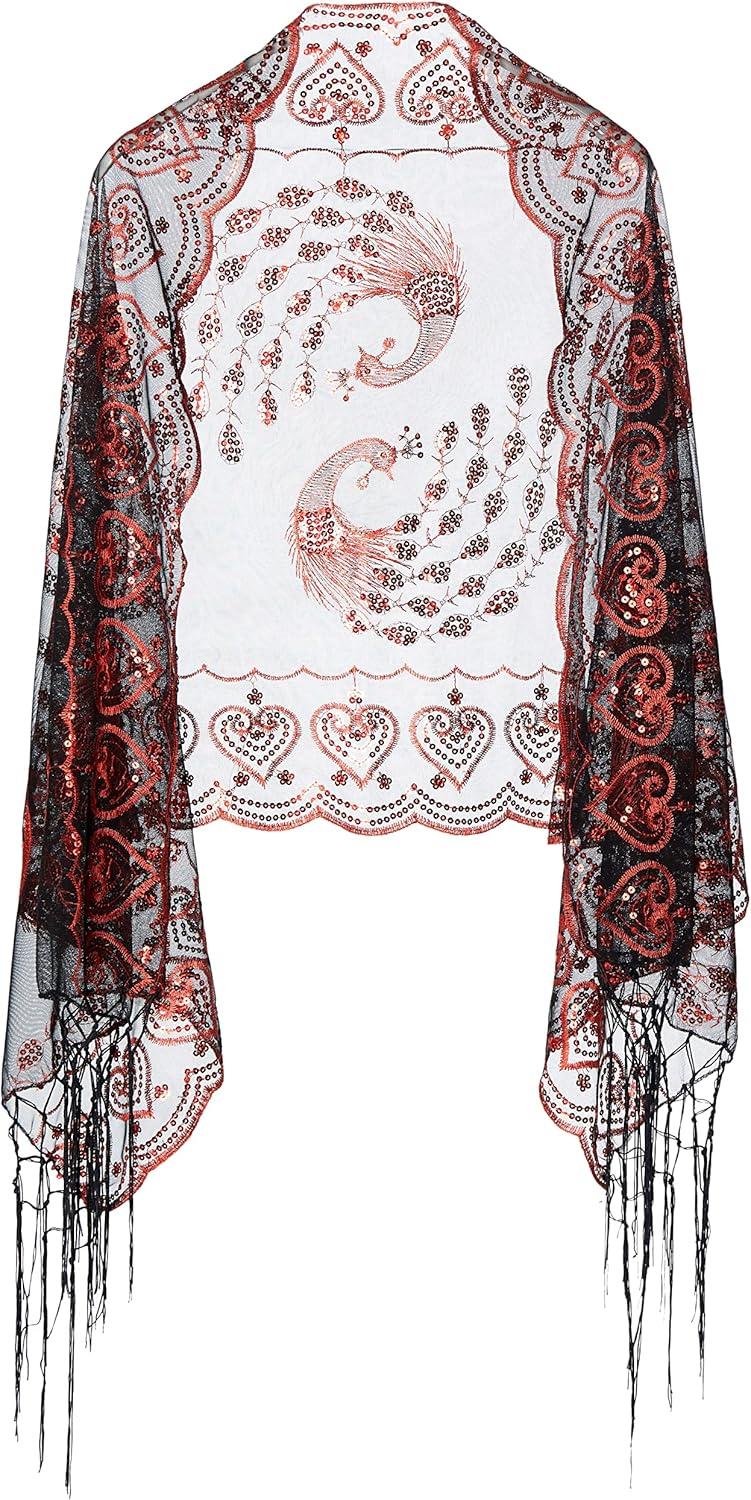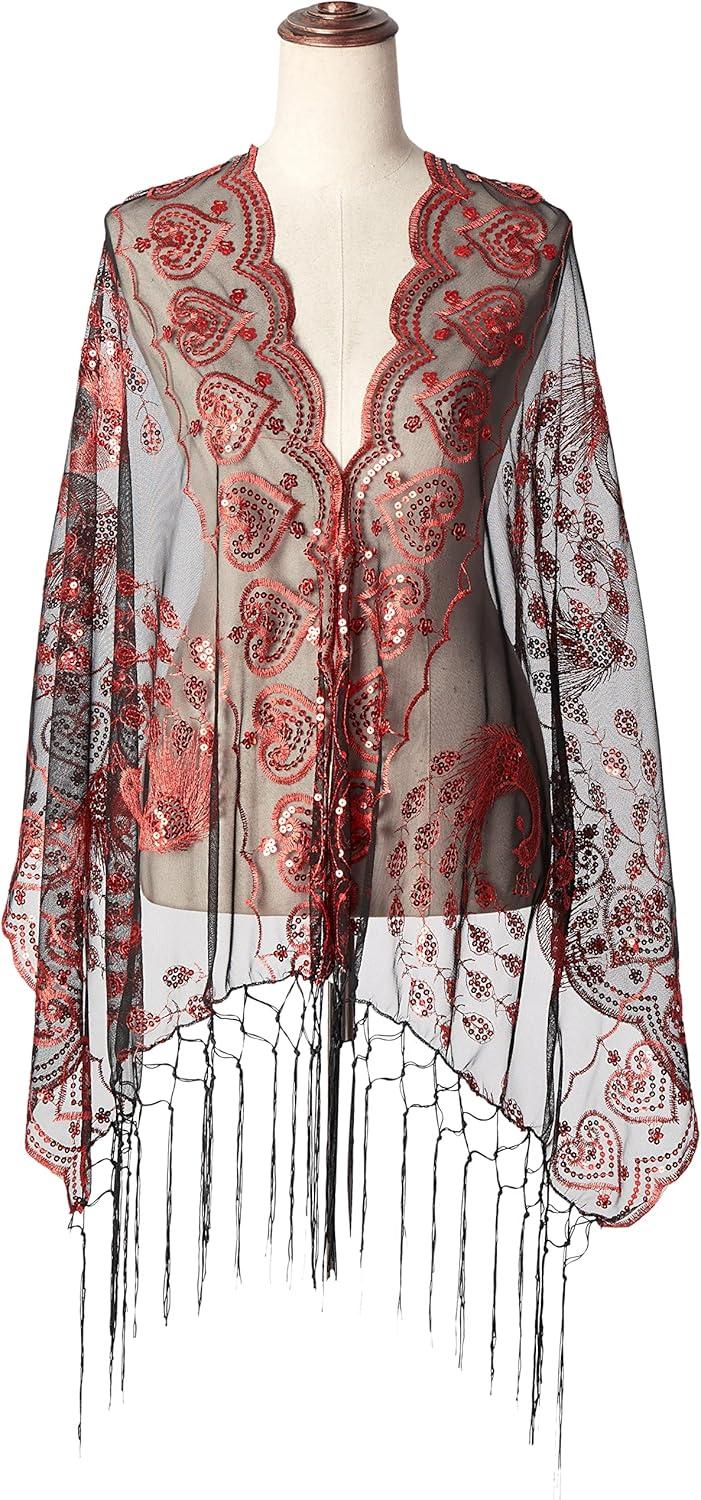 BABEYOND 1920s Sequined Shawl Wraps for Women Fringed Evening Cape Wedding Bridal Shawl Scarf for Evening Dresses Party(Black Red)