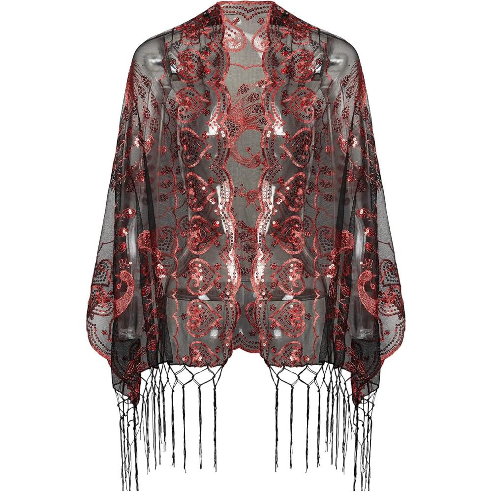 imageBABEYOND 1920s Sequined Shawl Wraps for Women Fringed Evening Cape Wedding Bridal Shawl Scarf for Evening Dresses PartyBlack Red