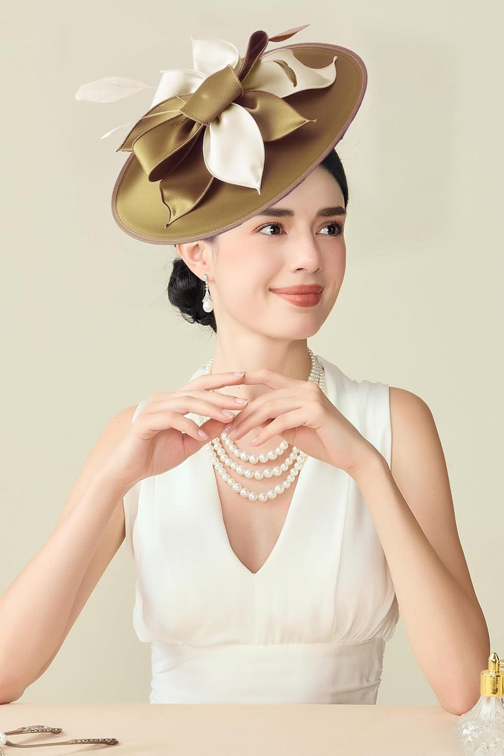 BABEYOND Derby Hats for Women – Fascinators Tea Party Hats Headband Wide Brim Fascinator Wedding Cocktail Flower Feathers(Champagne)