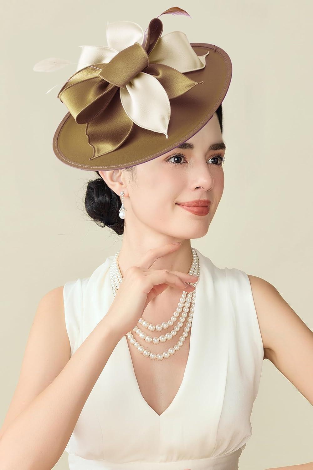 BABEYOND Derby Hats for Women - Fascinators Tea Party Hats Headband Wide Brim Fascinator Wedding Cocktail Flower Feathers(Coffee)
