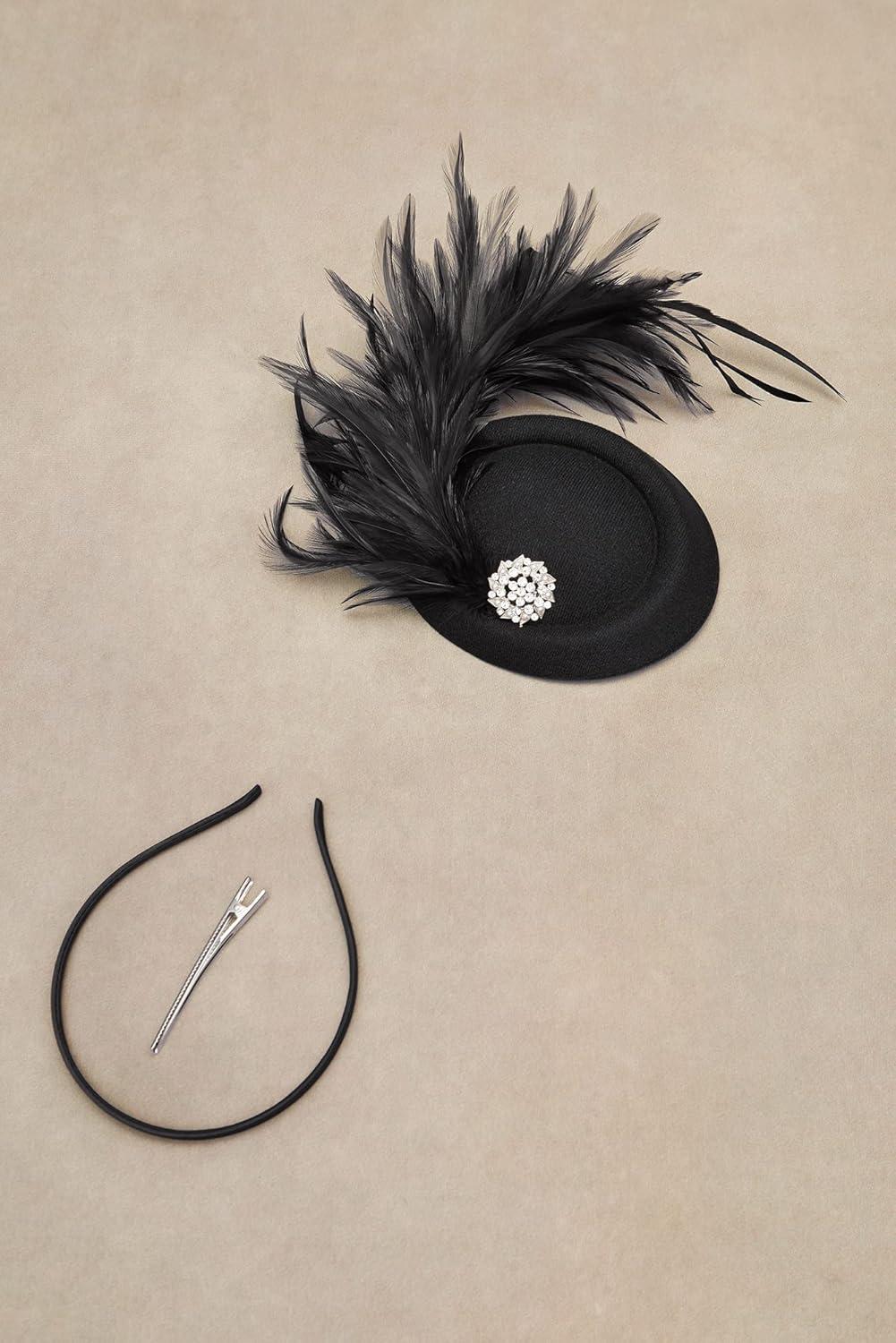 Feature: Easily and firmly secured with detachable metal hair clip and headband; Classic pillbox hat base; Sparkling crystals decoration and fluffy feathers.