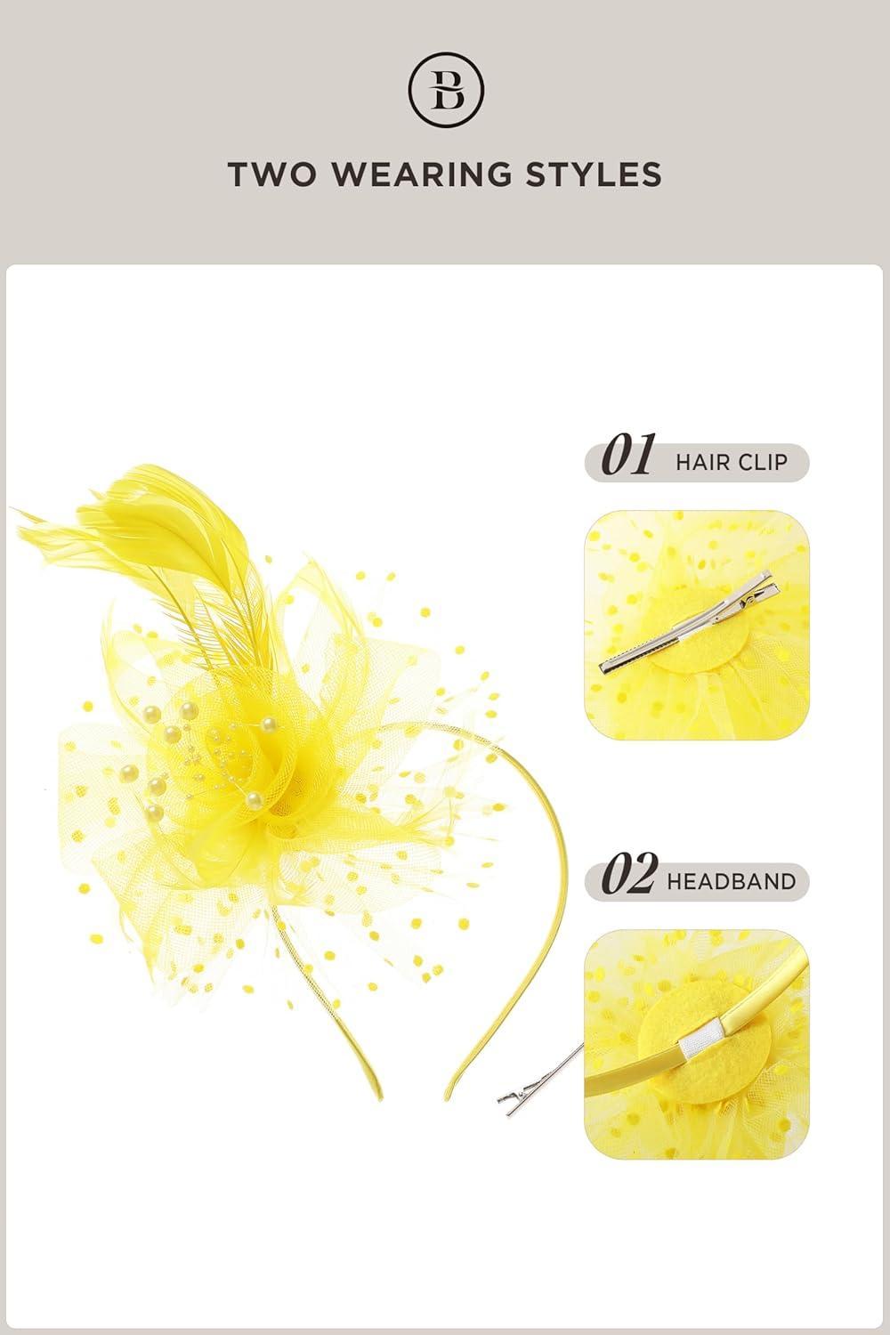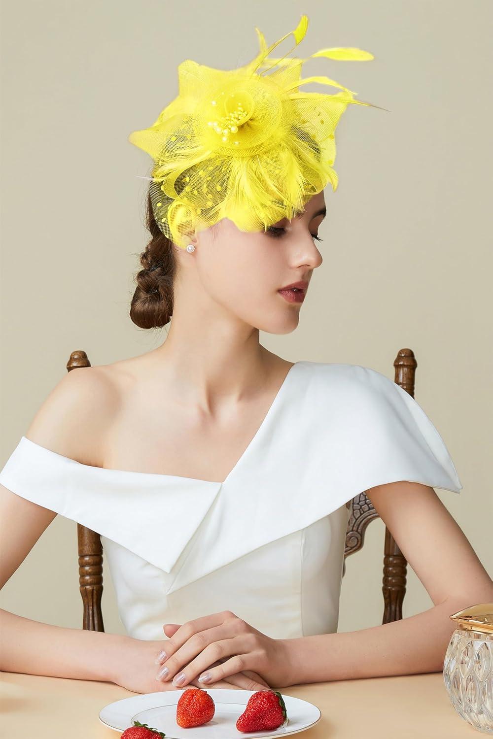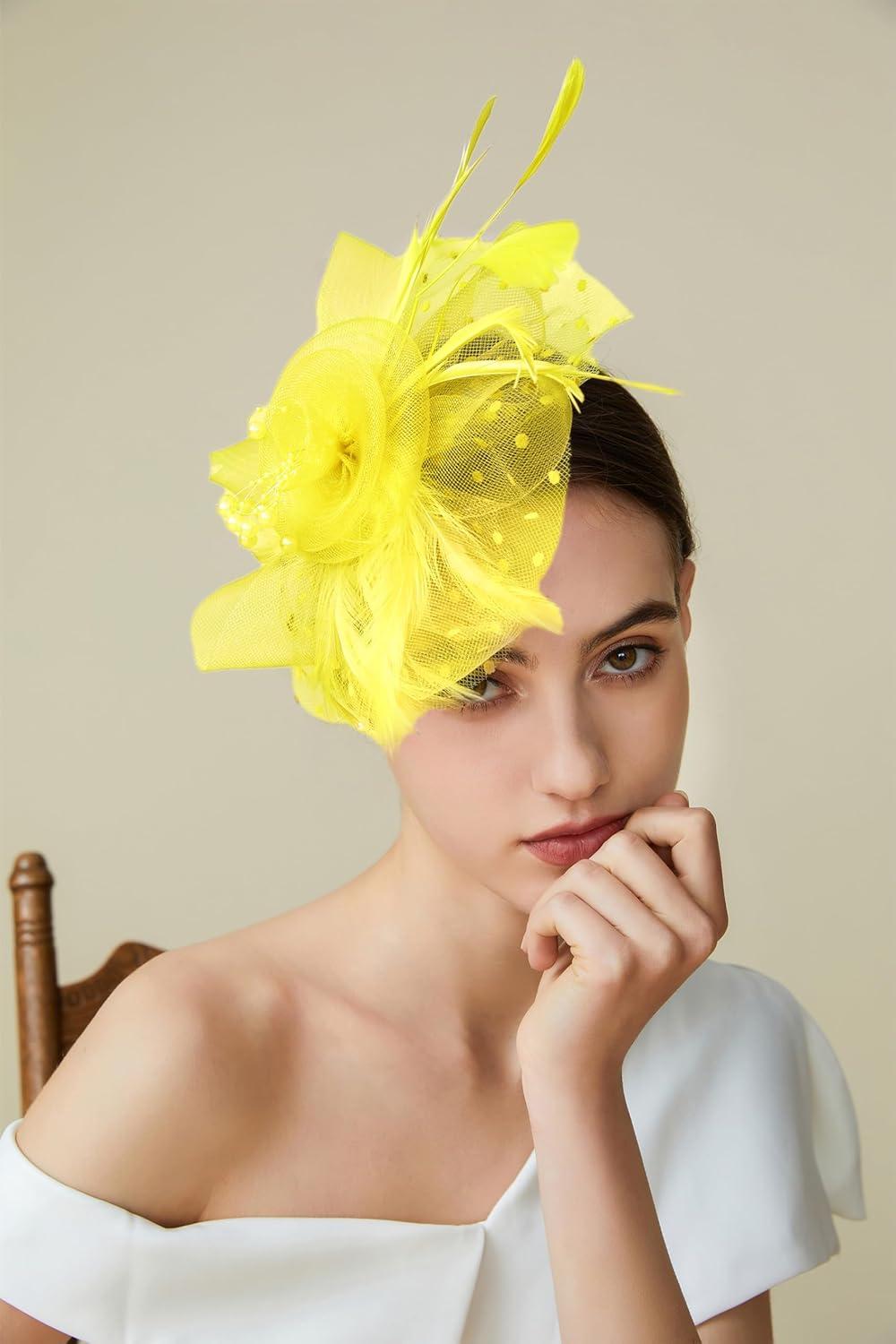 BABEYOND Fascinator Hats for Women Tea Party Hat Kentucky Fascinators Headband Derby Hats Wedding Flower Feathers Hair Clip(Yellow)
