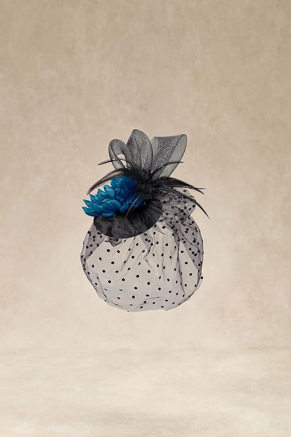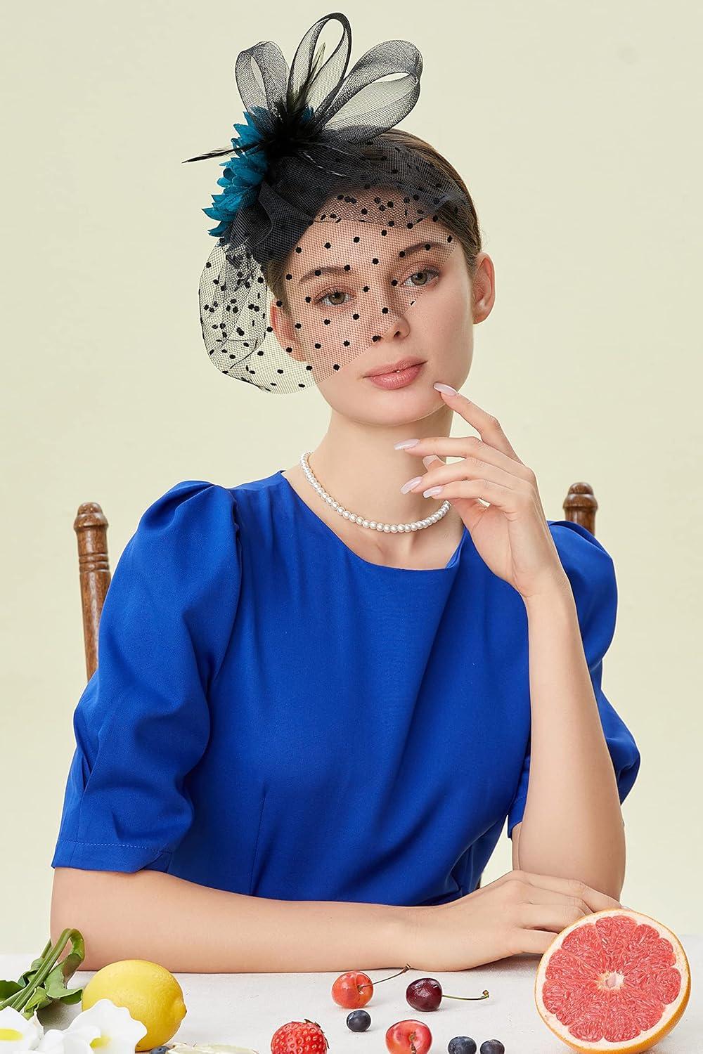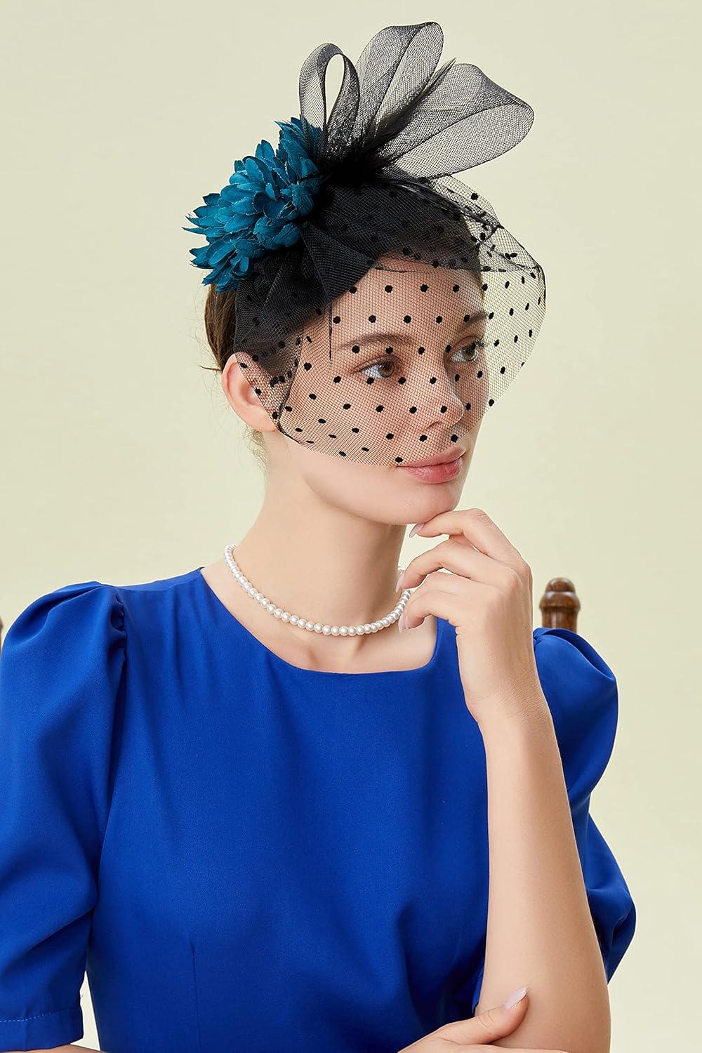 BABEYOND Fascinator Hats for Women - Tea Party Hats Kentucky Fascinators Derby Hat Wedding Cocktail Flower Feathers Hair Clip(B-black With Navy Blue Flower)