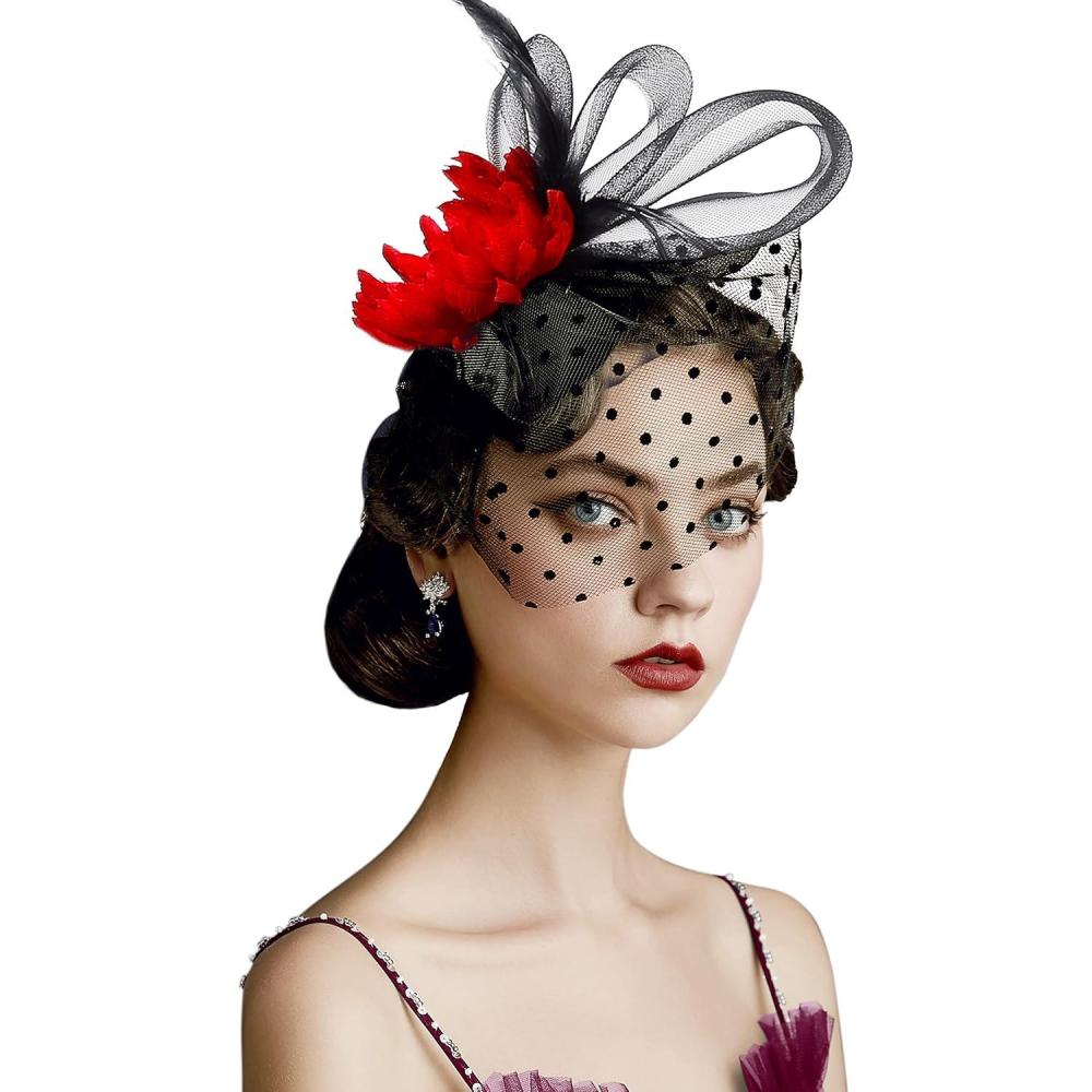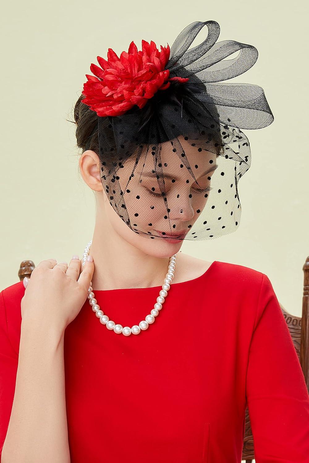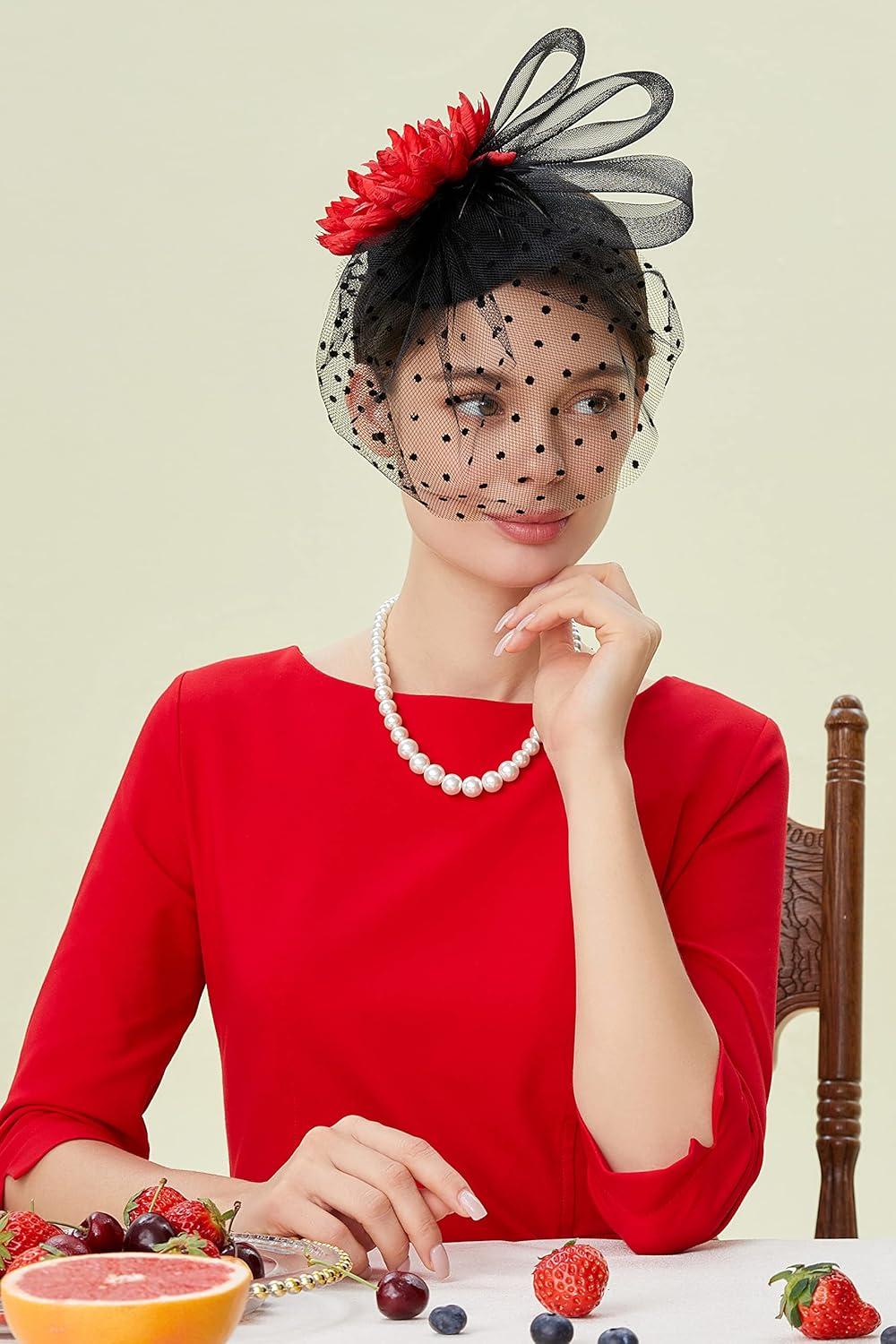 imageBABEYOND Fascinator Hats for Women  Tea Party Hats Kentucky Fascinators Derby Hat Wedding Cocktail Flower Feathers Hair ClipBblack With Red Flower