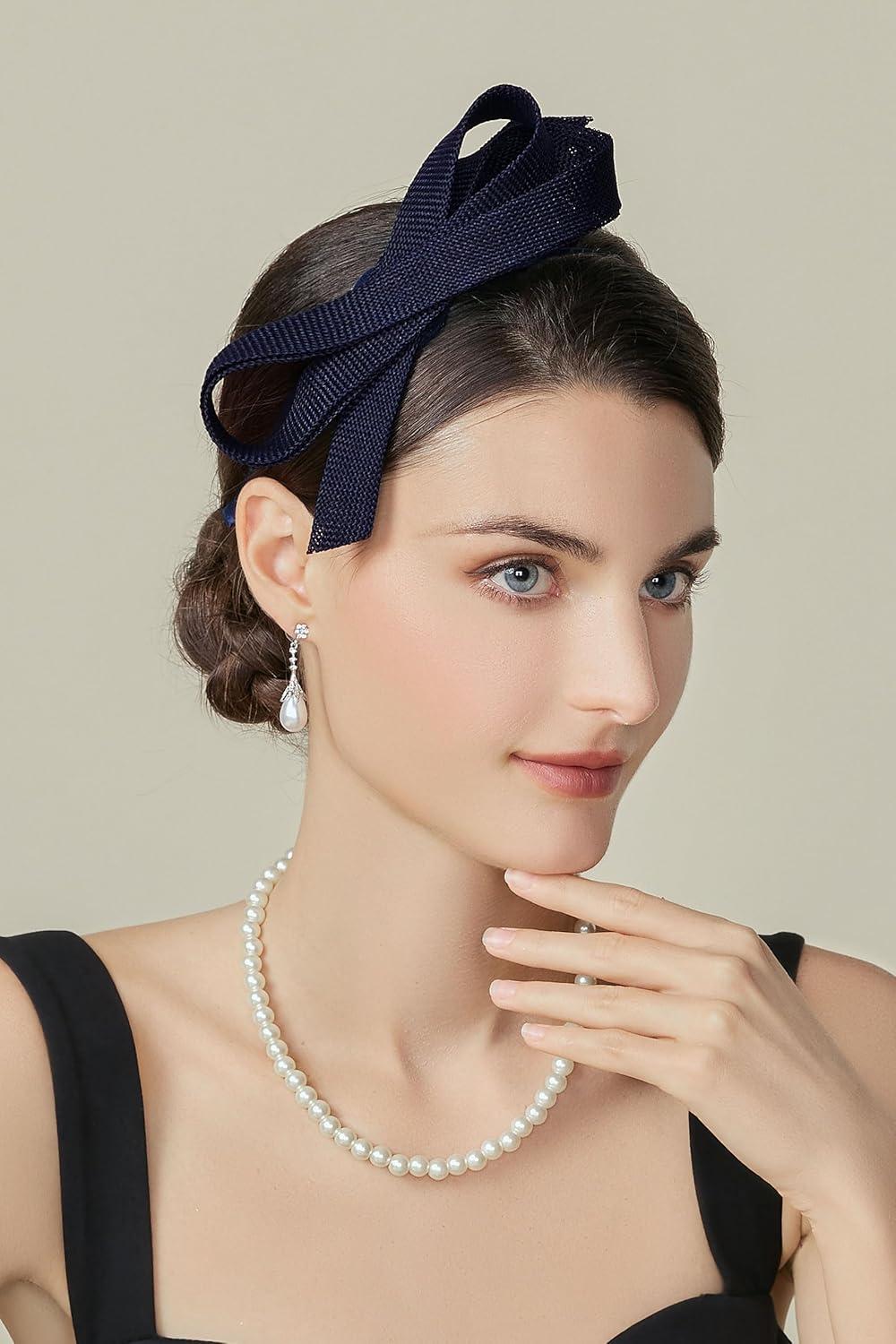 BABEYOND Fascinator Headband for Women - Tea Party Kentucky Bow Headband Derby Cocktail Wedding Ribbon Hair Clip for Daily(Navy Blue)