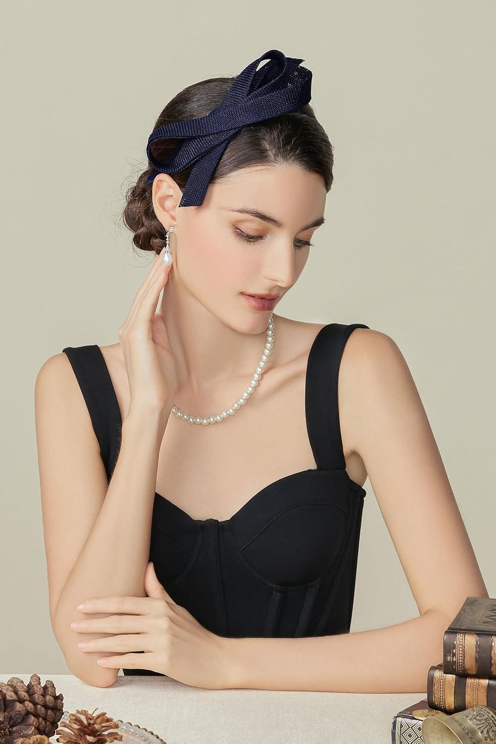 BABEYOND Fascinator Headband for Women – Tea Party Kentucky Bow Headband Derby Cocktail Wedding Ribbon Hair Clip for Daily(Navy Blue)