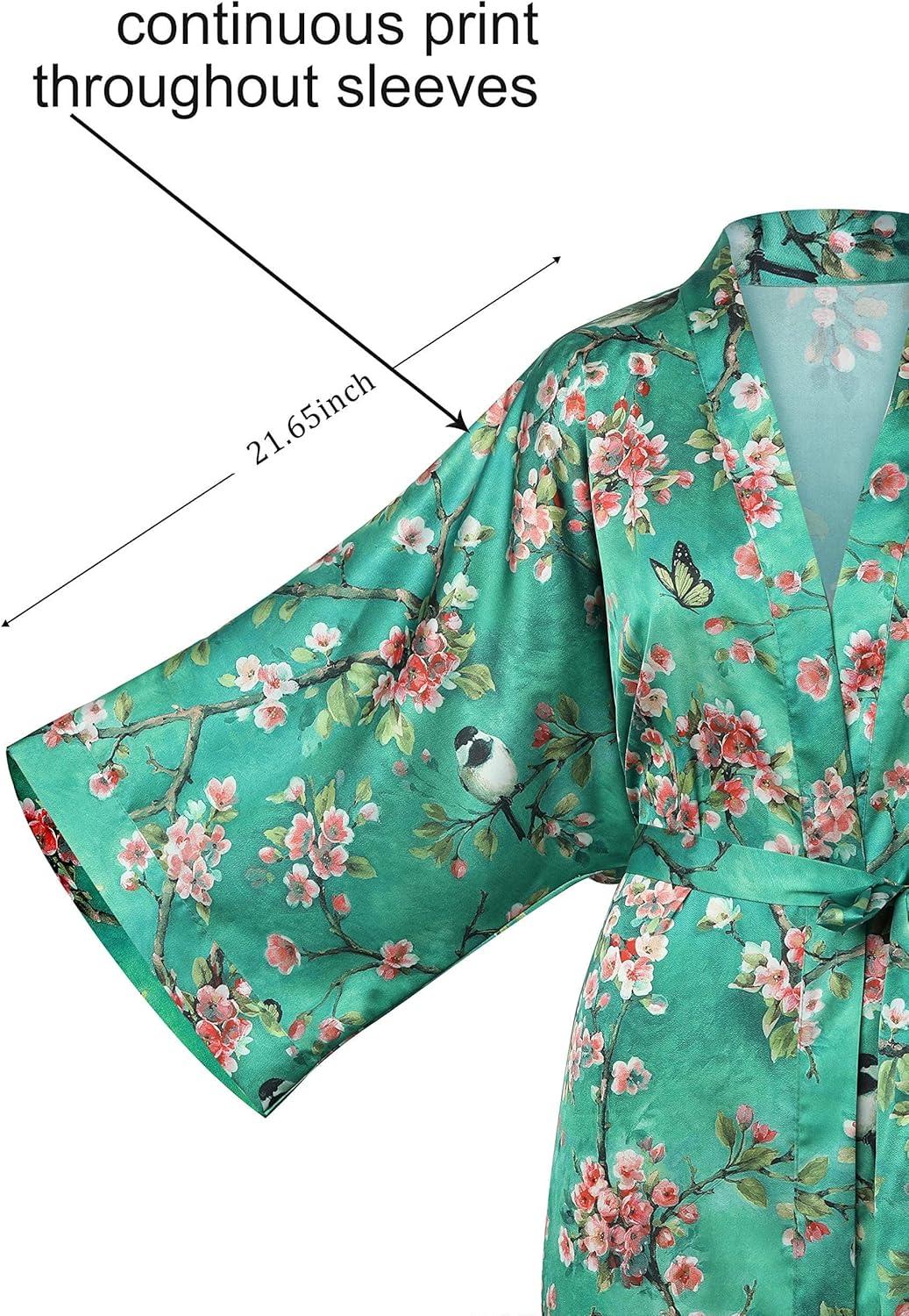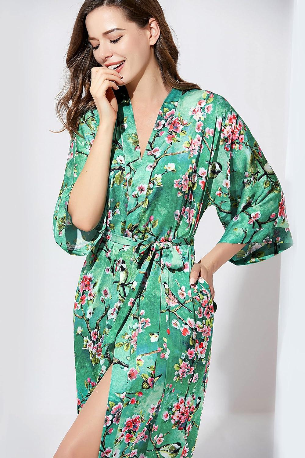 imageBABEYOND Floral Kimono Robe Satin Silky Wedding Robe Lightweight Long Kimono Nightgown SleepwearMalachite Green