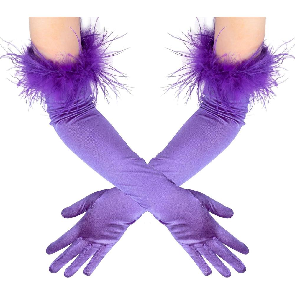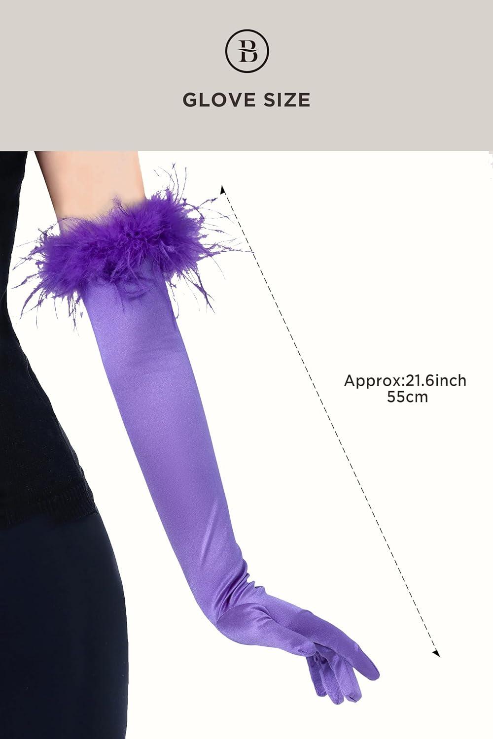 BABEYOND Long Satin Opera Gloves - Pageant Feather Gloves 1920s Stretchy Elbow Gloves for Halloween Costume Evening Party(Purple)