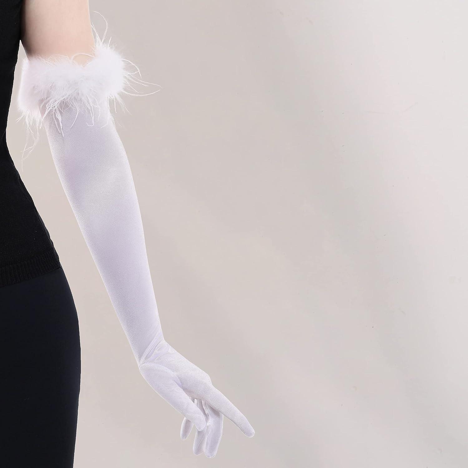 BABEYOND Long Satin Opera Gloves - Pageant Feather Gloves 1920s Stretchy Elbow Gloves for Halloween Costume Evening Party(White)