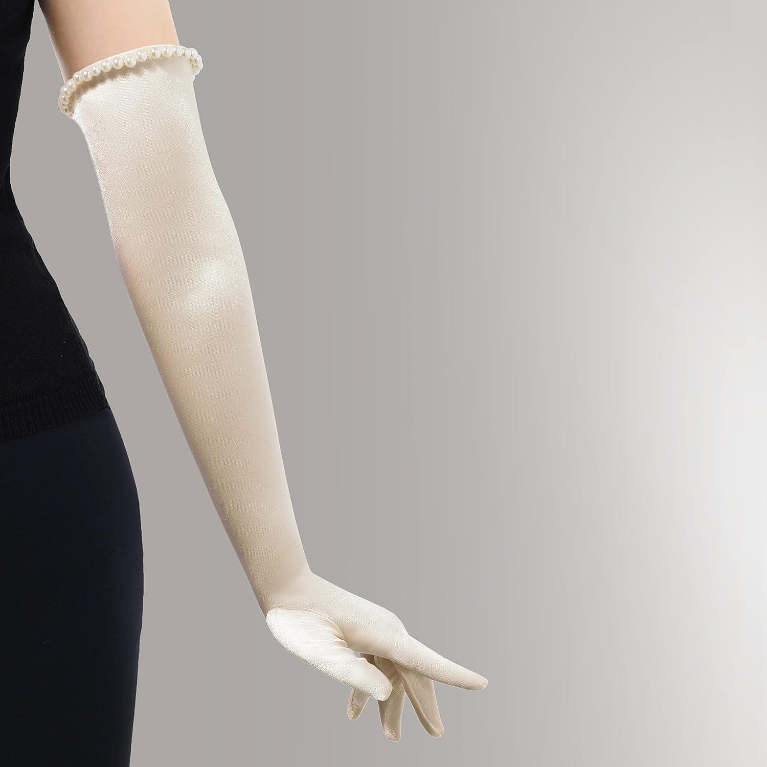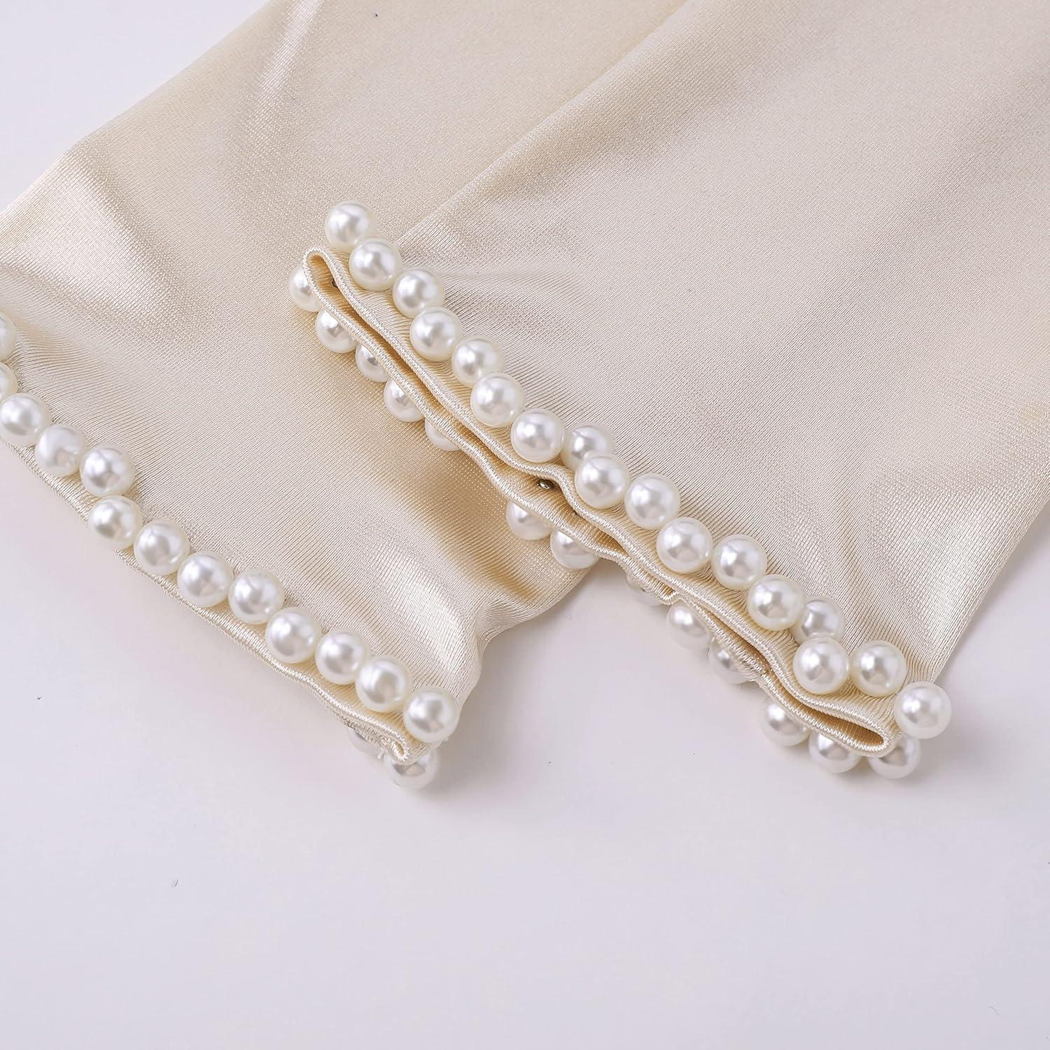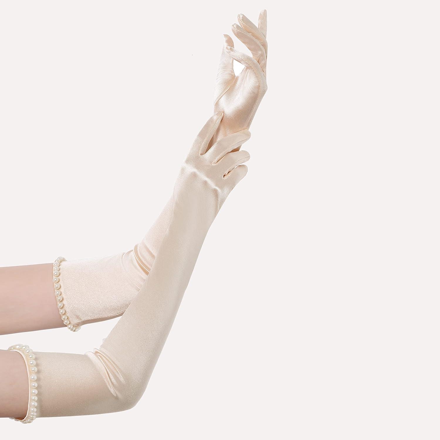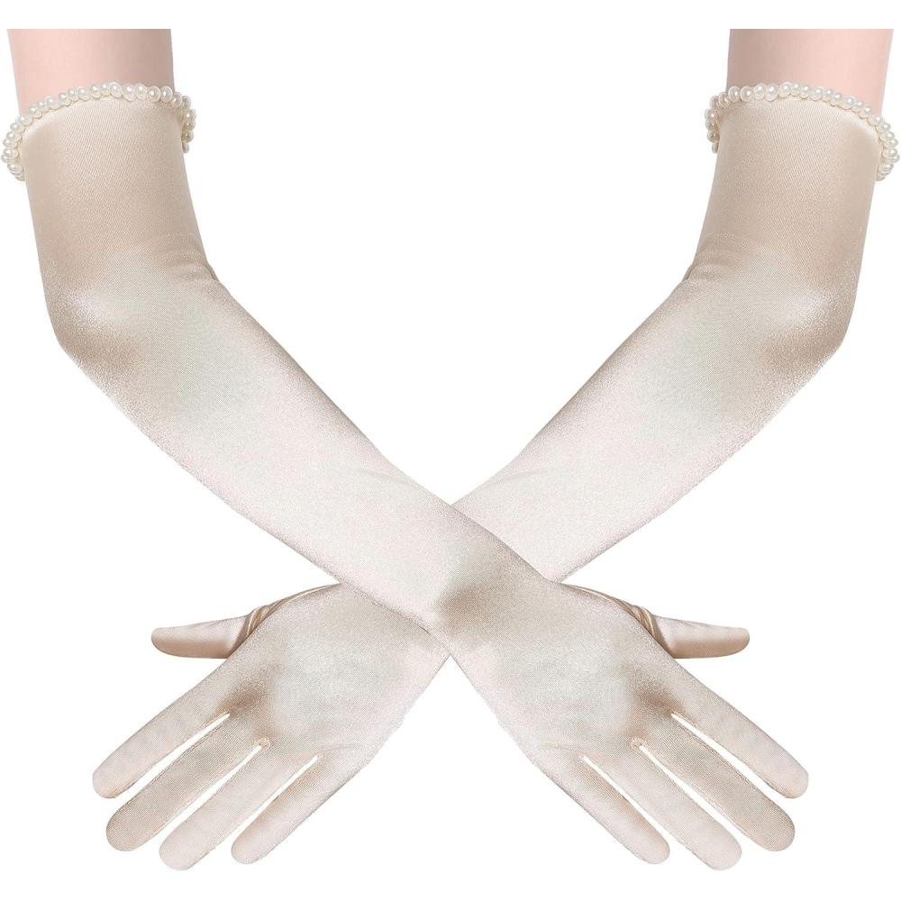 BABEYOND Opera Gloves for Women - 20s Cuff Pearl Satin Gloves Stretchy Adult Size Elbow Length for Gatsby Theme Party(Champagne)