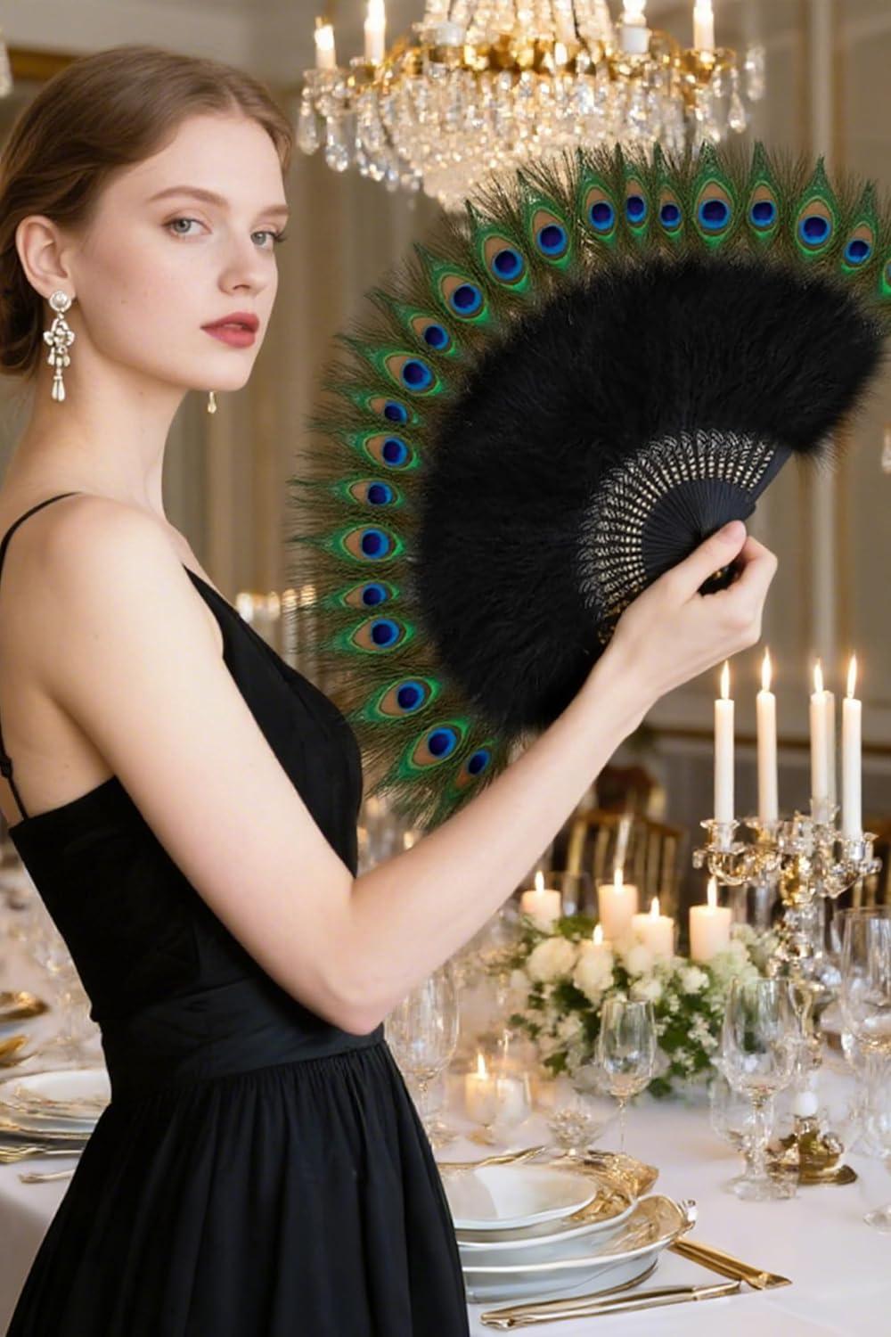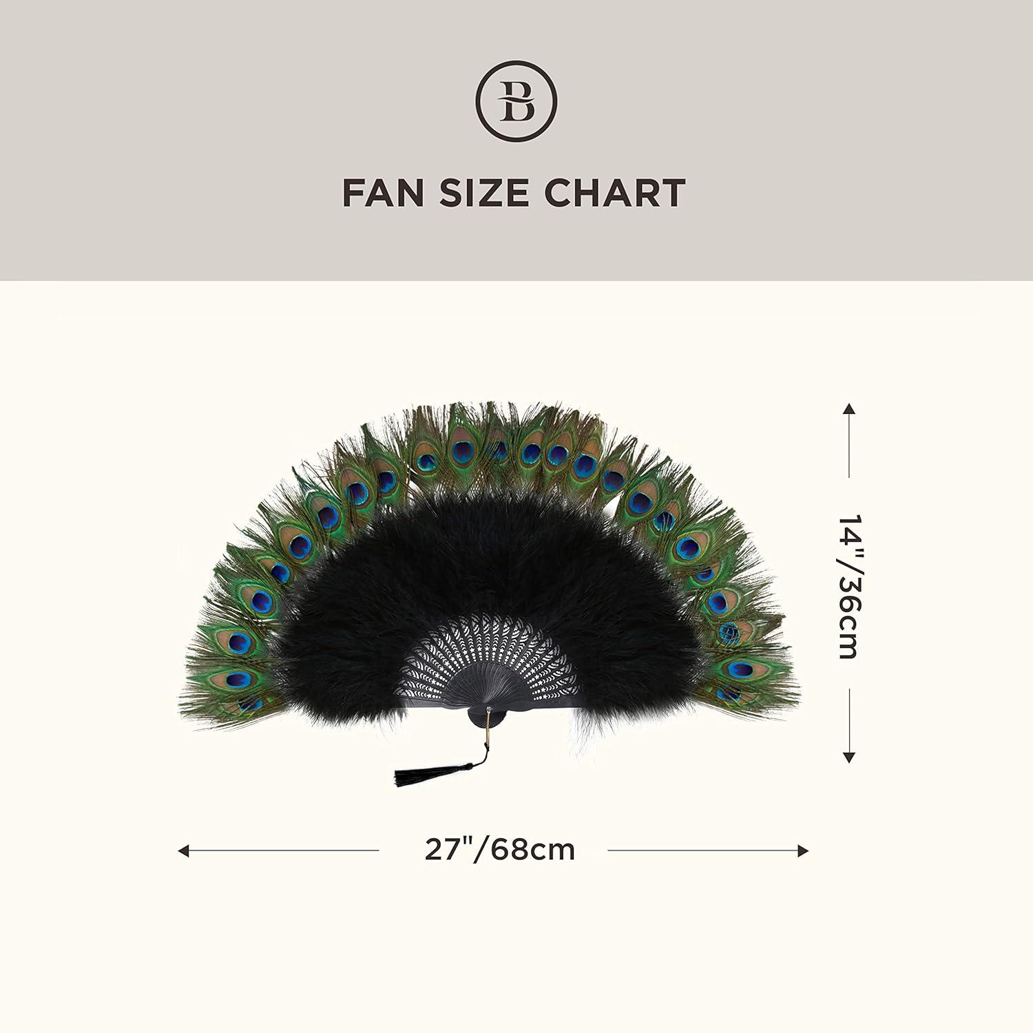 BABEYOND Peacock Marabou Feather Fan - Roaring 20s Vintage Style Flapper Accessories for Costume Halloween Tea Party(Black-black Rib)