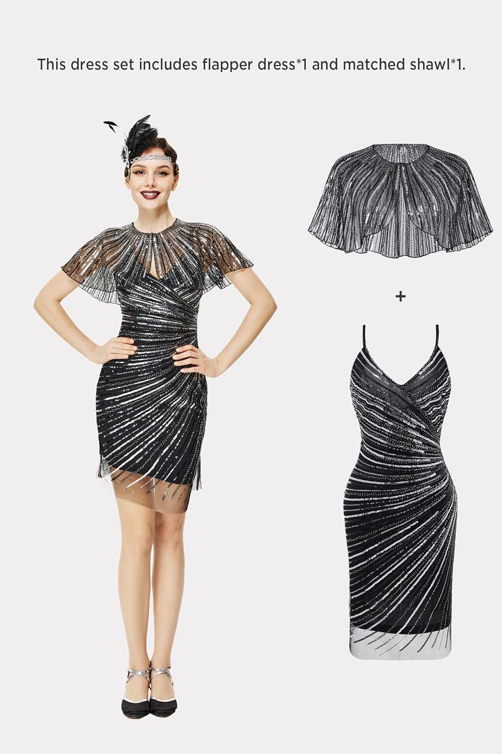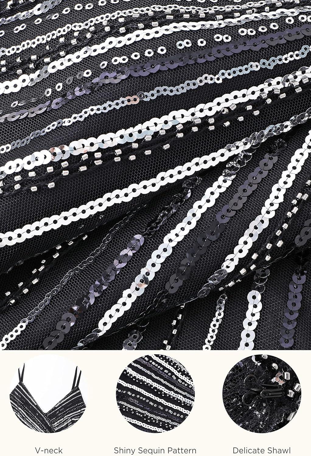 BABEYOND Prom Women Dress Set – 1920s Gatsby Suitable Party Sequin Dress with Vintage Shawl(Black Silver)