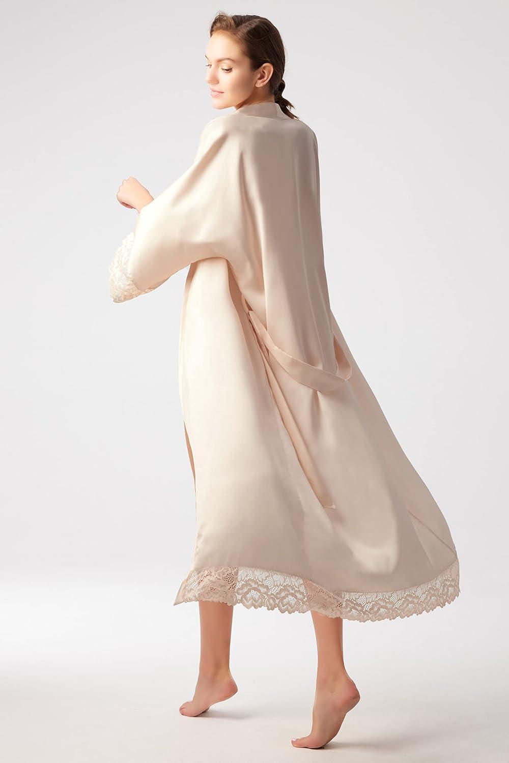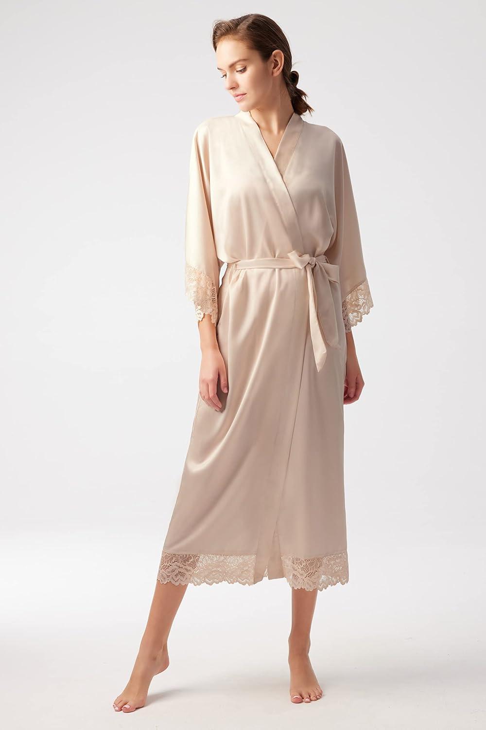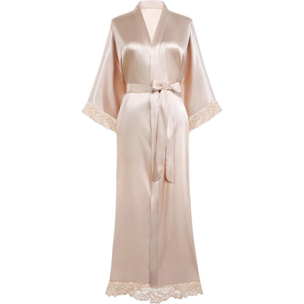 BABEYOND Satin Kimono Robe Silky Long Bridesmaid Wedding Lightweight Bath Robe with Lace Trim(Champagne)