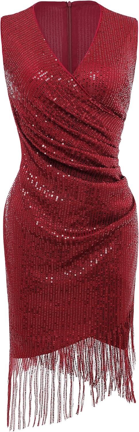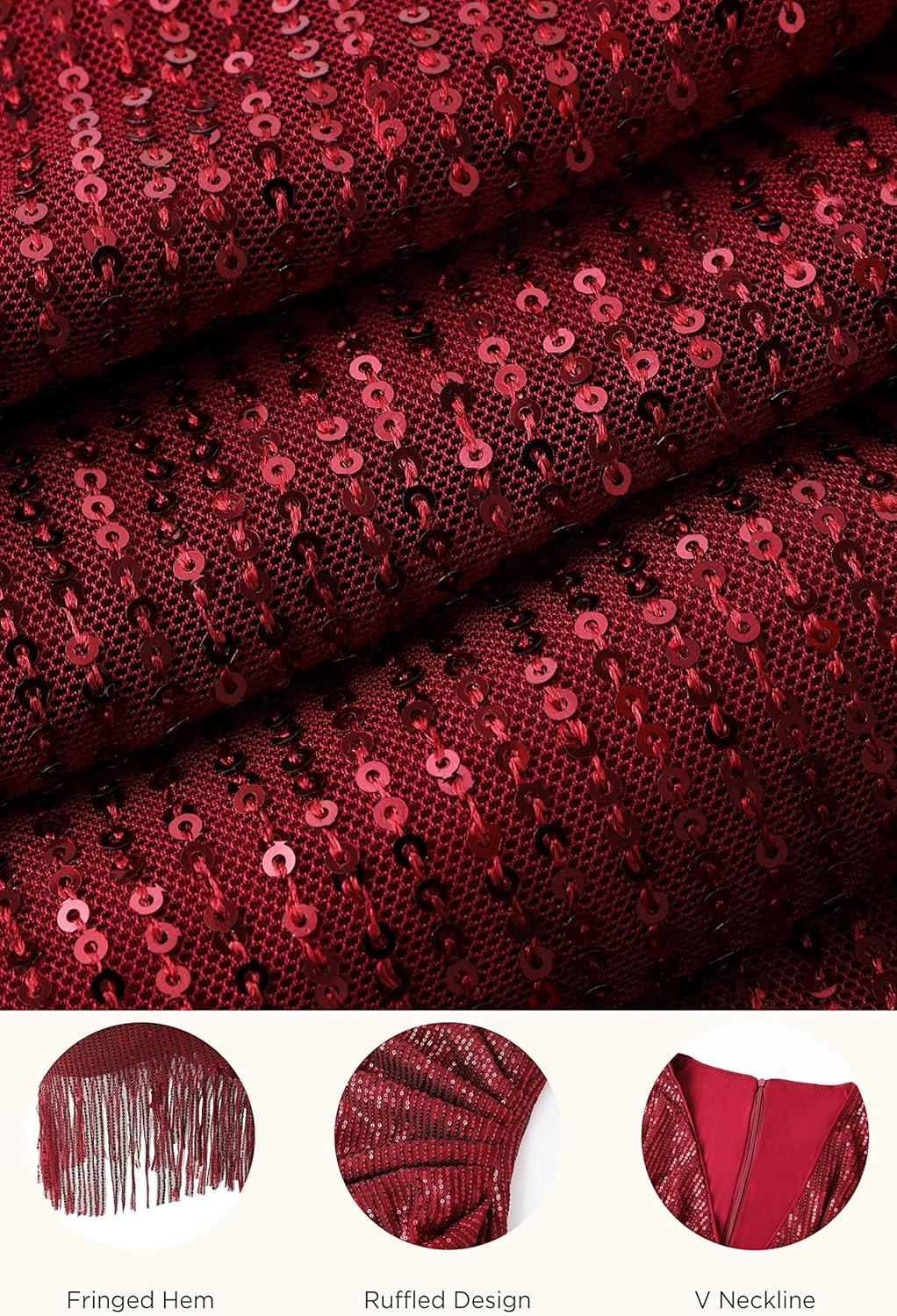 Feature: A-line silhouette; zipper closure; deep V neck; sleeveless; overall sequins; over knee length; wrap ruched design; fringe hem.