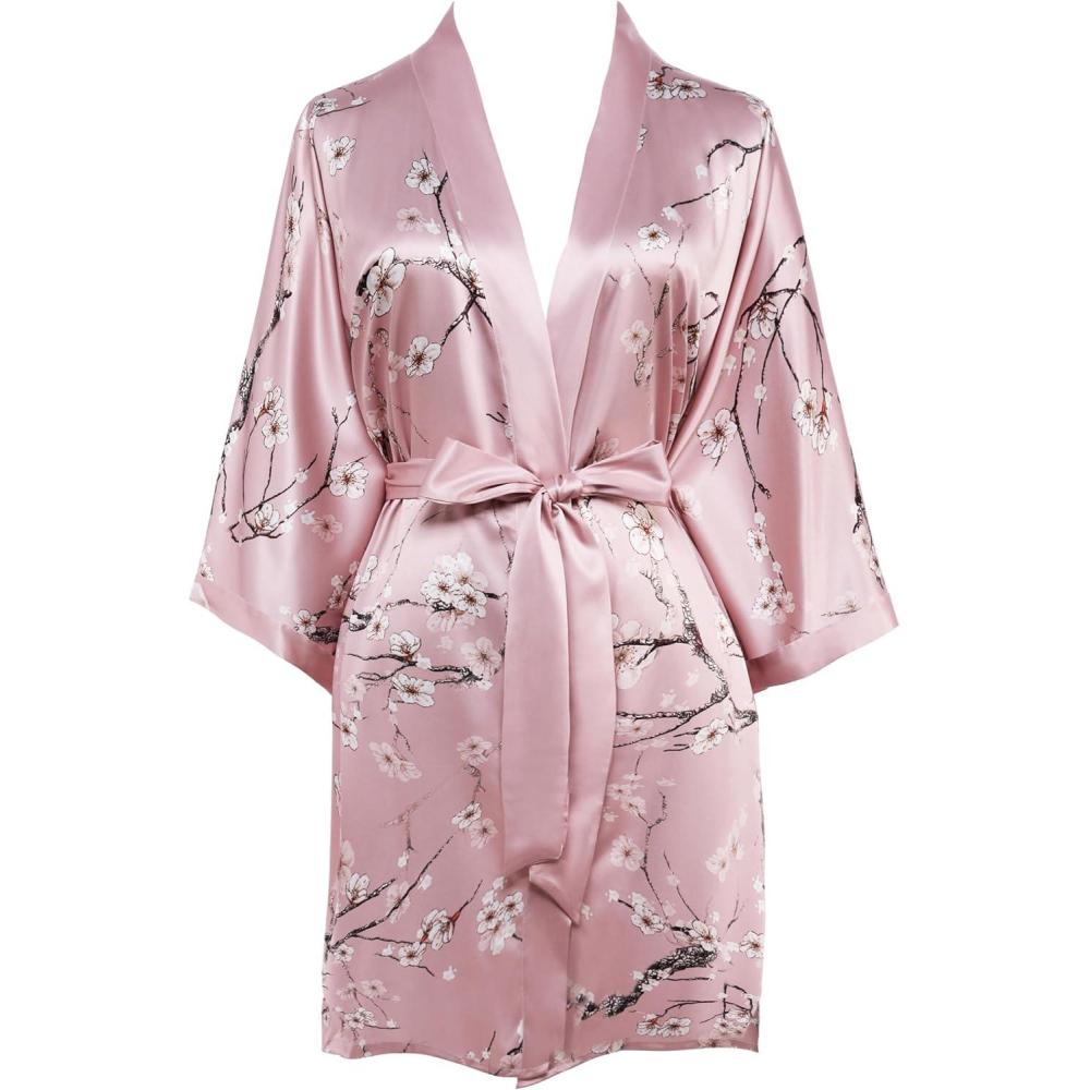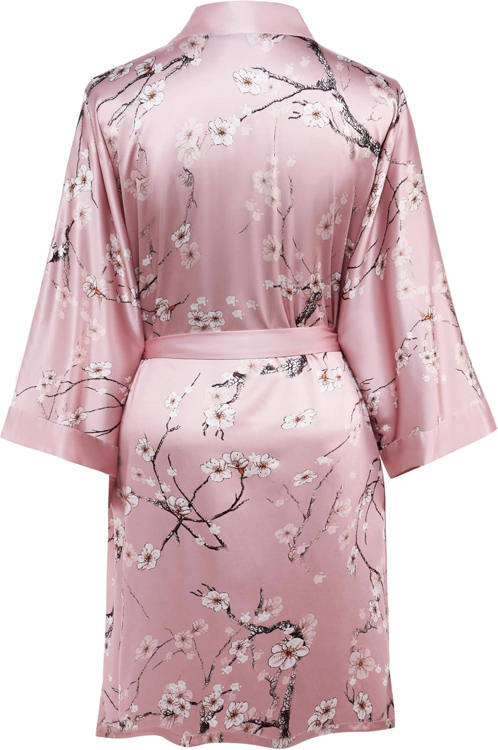 BABEYOND Short Kimono Bath Robe Blouse Satin Silky Kimono Cover Up Loose Cardigan Sleepwear Wedding Robe(Plum Blossom-pink)