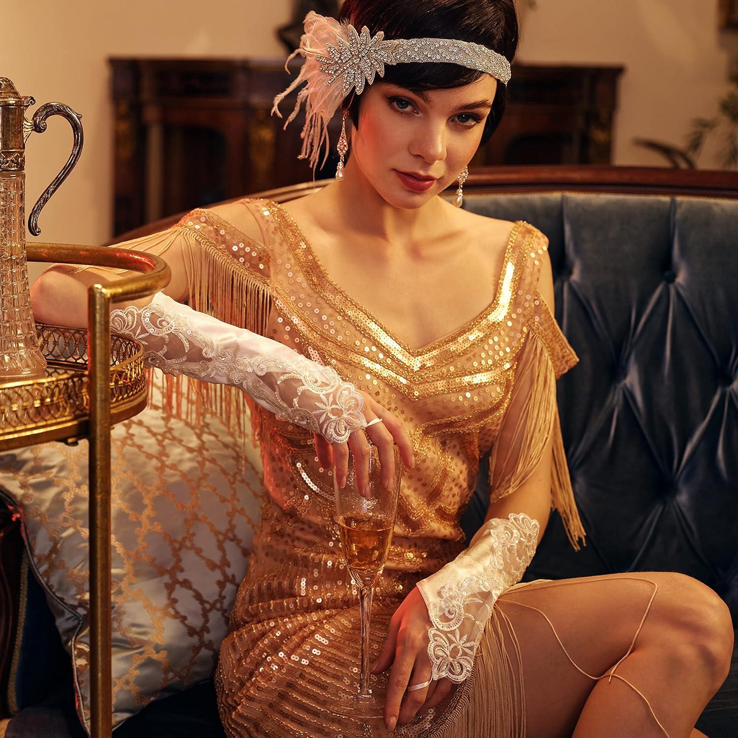 imageBABEYOND Lace Gloves for Women Long Floral Wedding Gloves for Bride Satin Elbow Length Flapper AccessoriesBlack