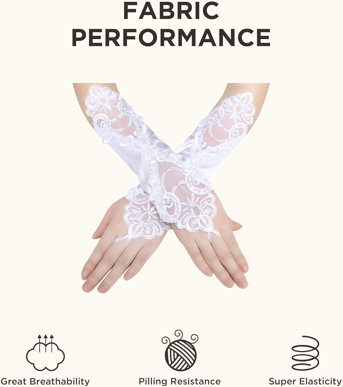 BABEYOND Short Opera Party 20s Satin Gloves Stretchy Adult Size Tea Party Wedding Lace Gloves 11.8 “(White)