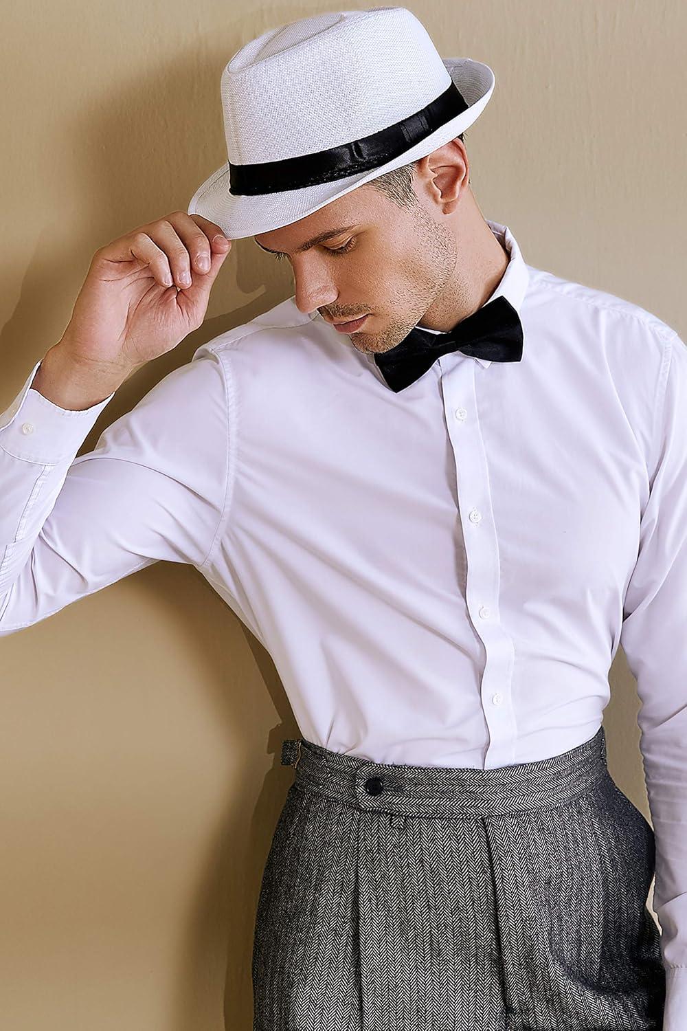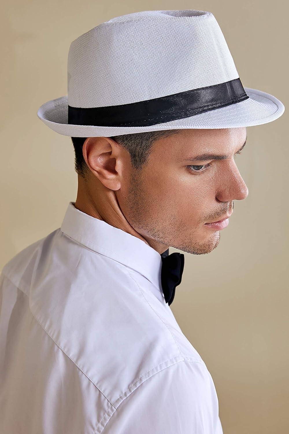 BABEYOND Straw Trilby Fedora Hat for Men-1920s Felt Panama Hat Short Brim Summer Cap with Ribbon(A-white)