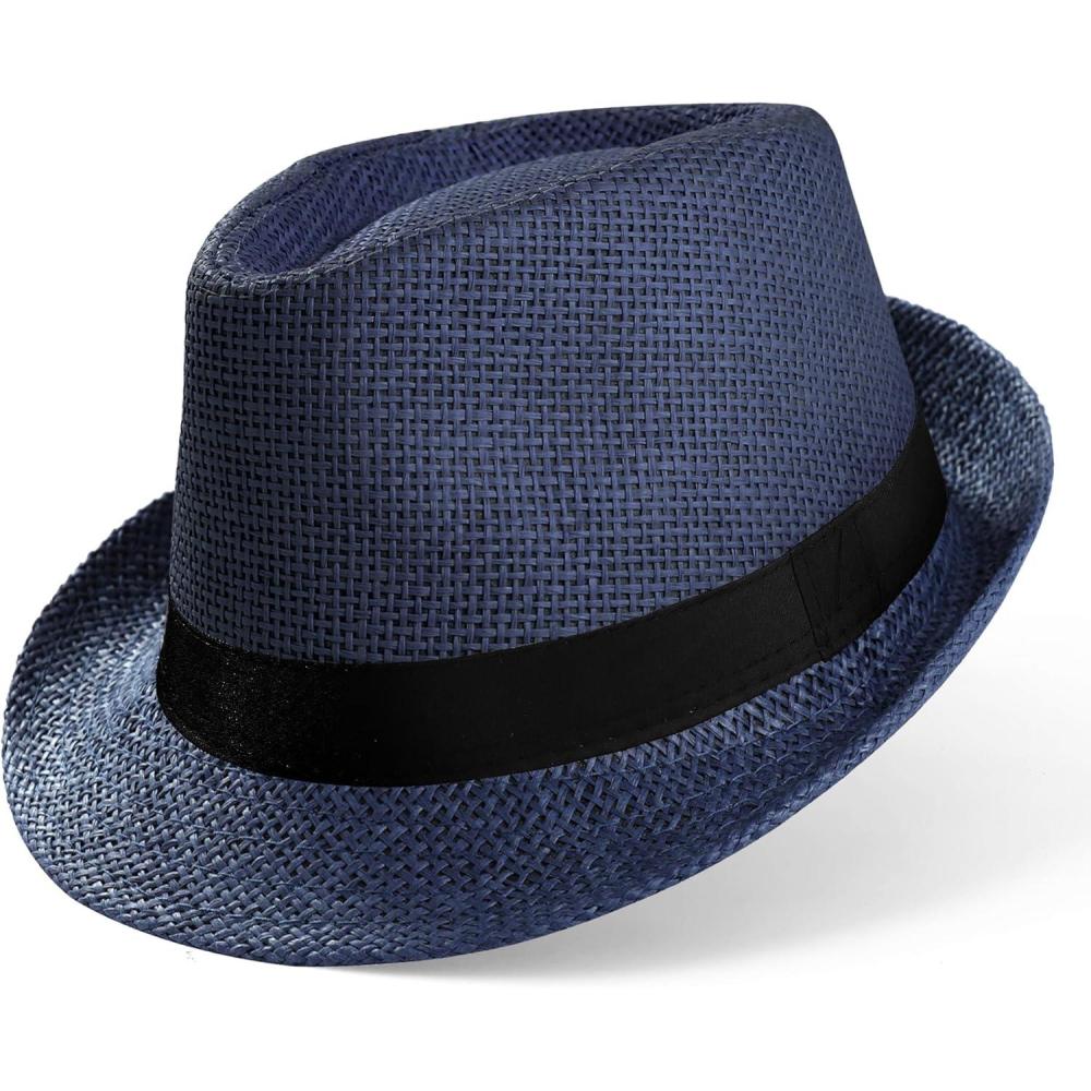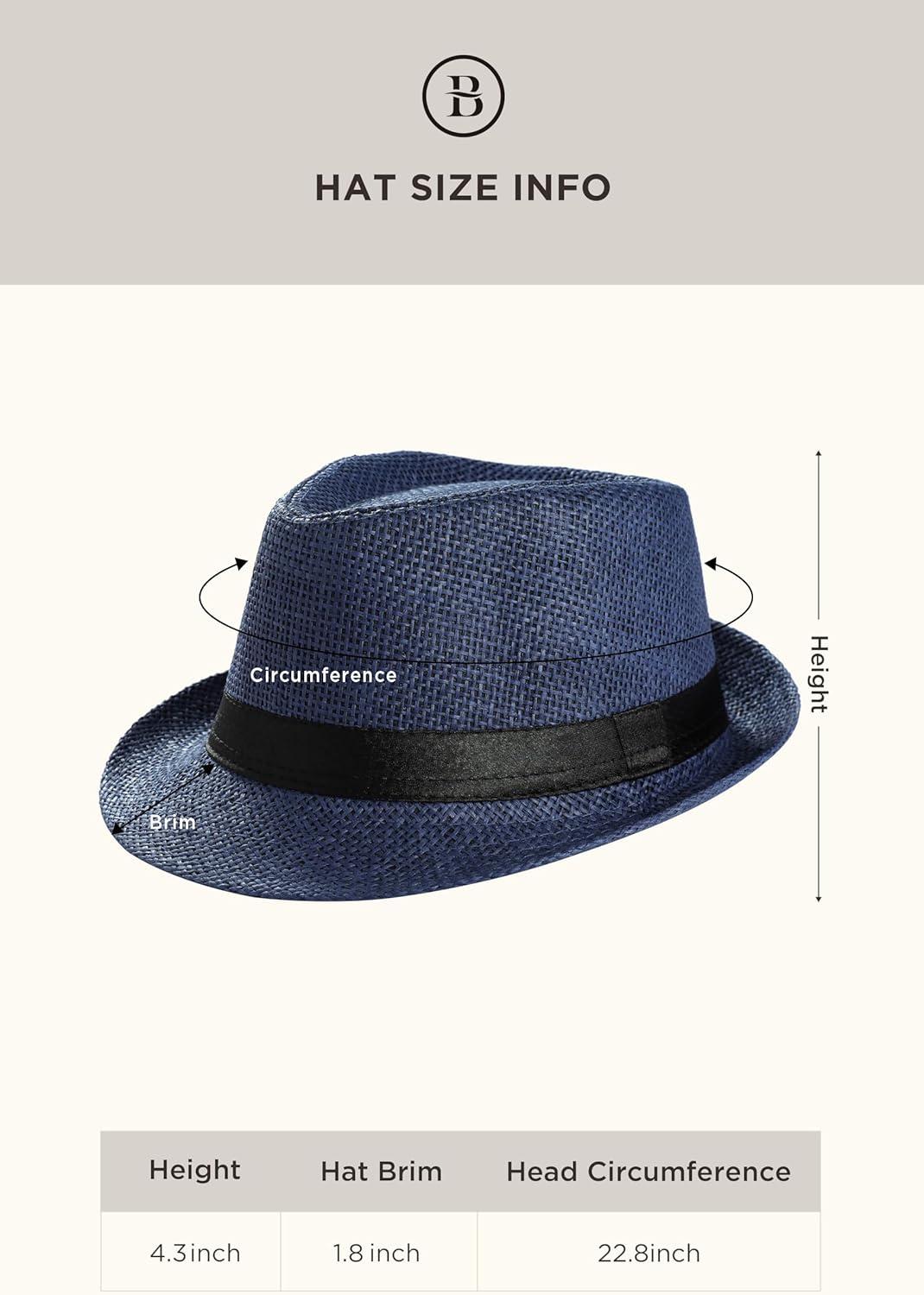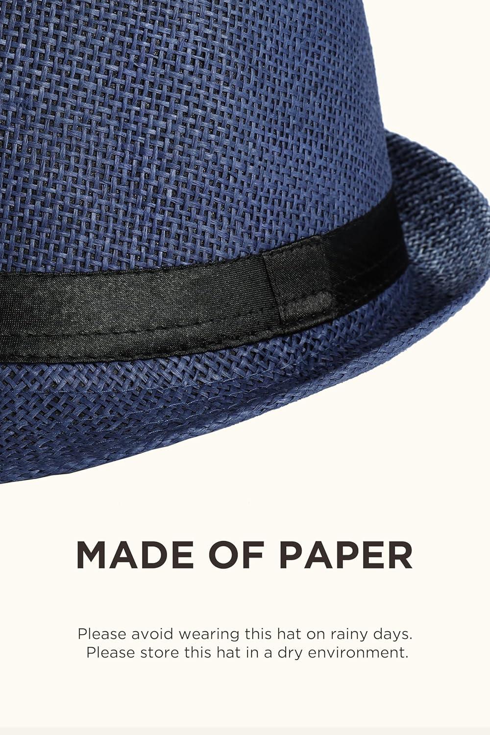 BABEYOND Straw Trilby Fedora Hat for Men-1920s Felt Panama Hat Short Brim Summer Cap with Ribbon(U-navy Blue)
