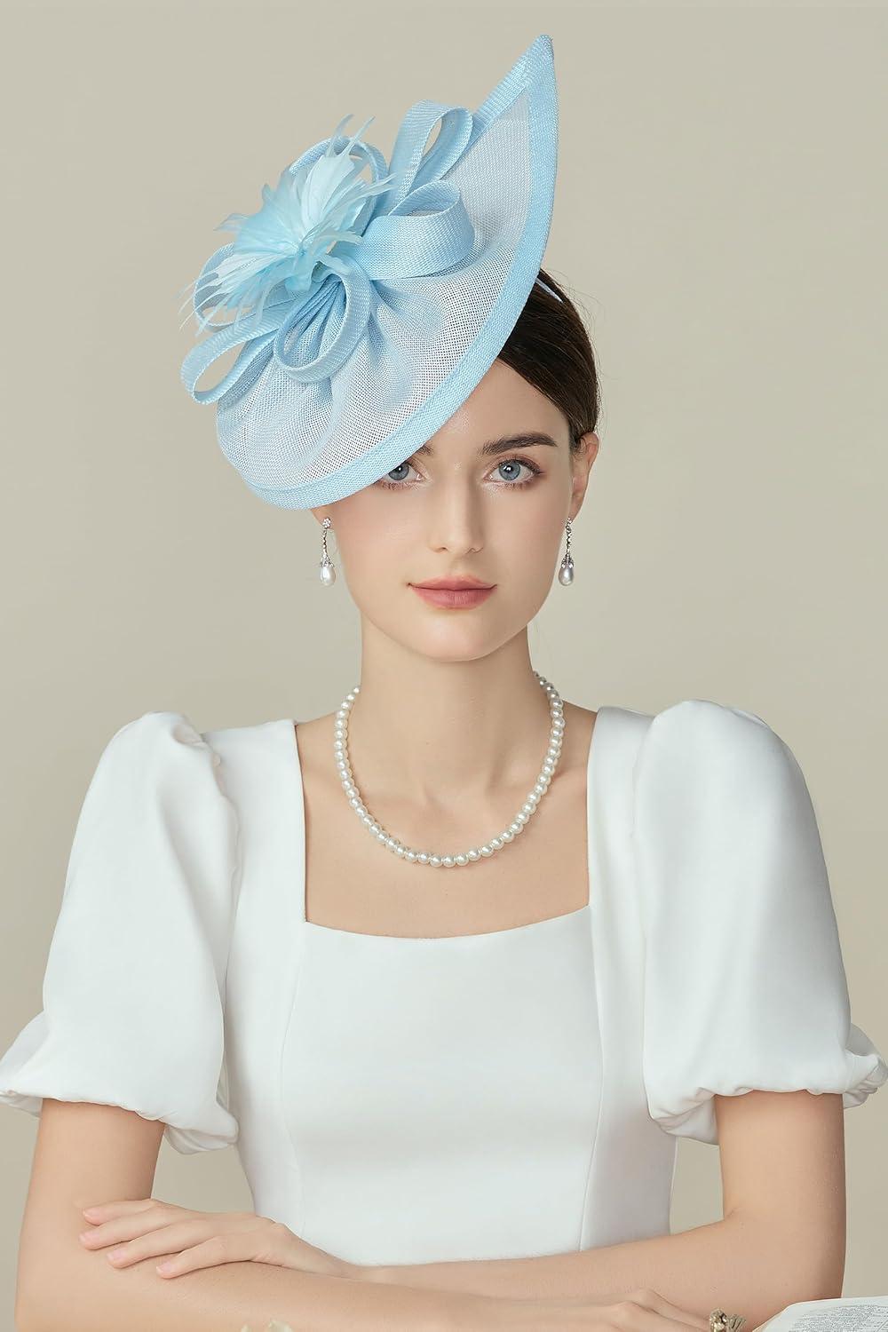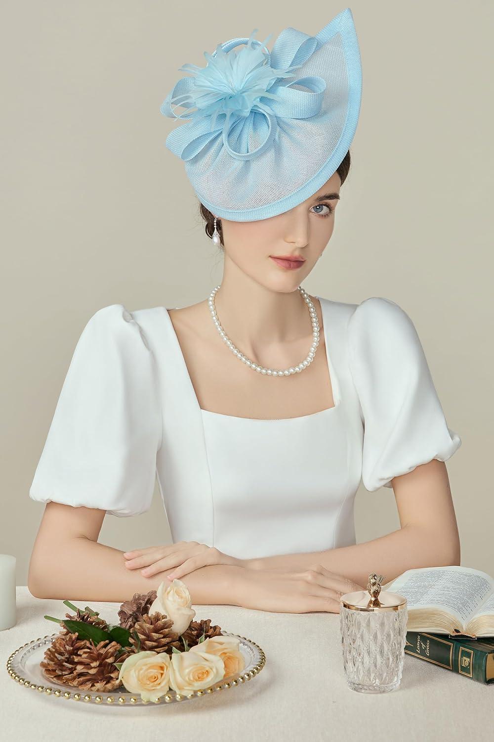 BABEYOND Tea Party Fascinator Hat for Women Kentucky Headwear Derby Pillbox Church Hat for Cocktail Wedding(Light Blue)
