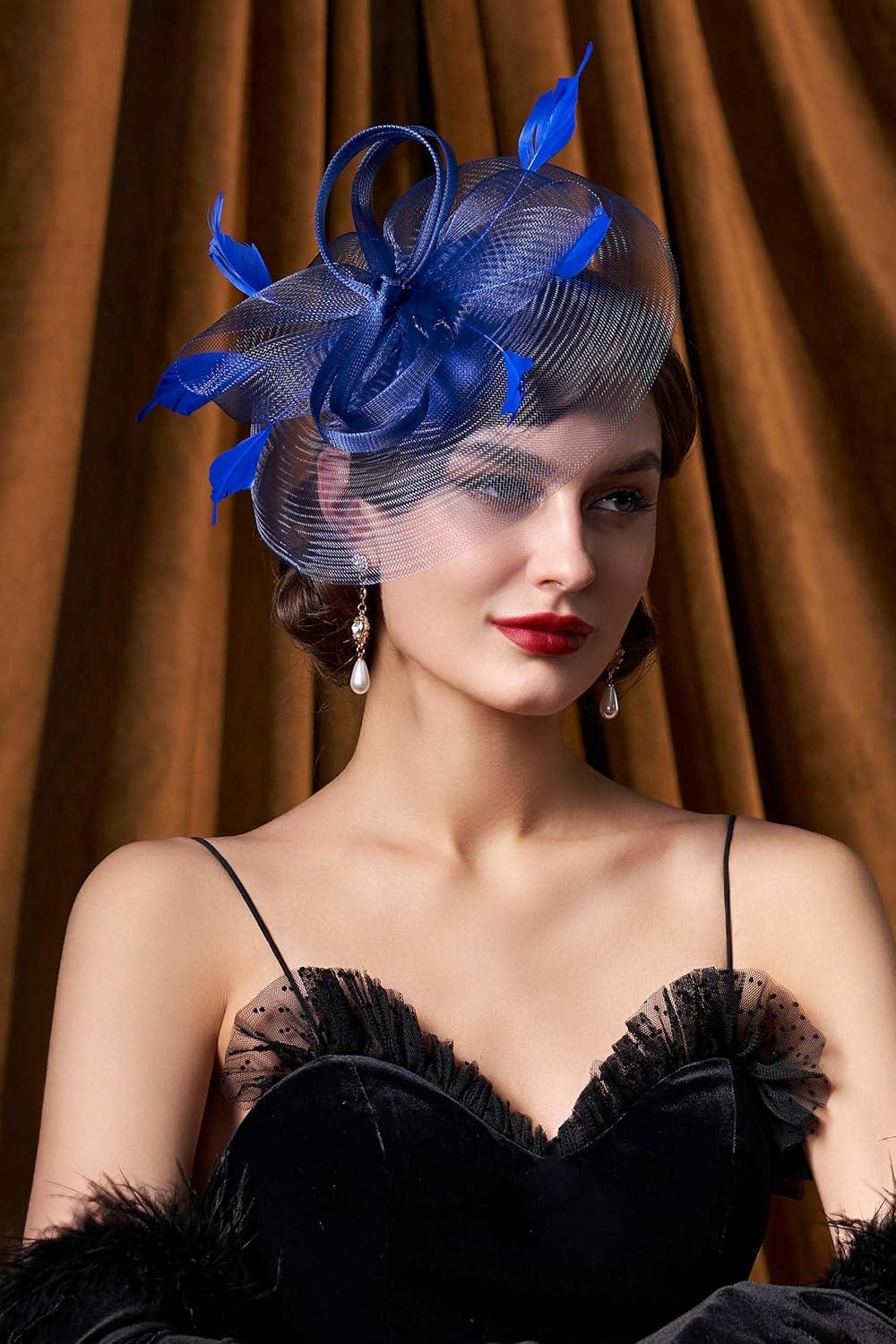 imageBABEYOND Womens Fascinator Hat Kentucky Hat Feather Derby Fascinator Tea Party Hat for Cocktail WeddingBlue