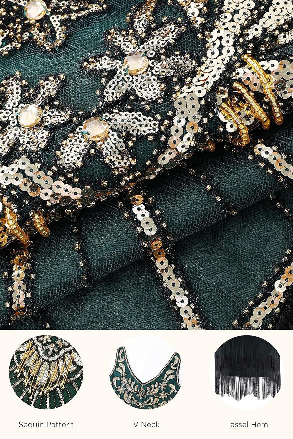 BABEYOND Women’s Flapper Dresses 1920s V Neck Beaded Fringed Great Gatsby Dress(Gold Green)