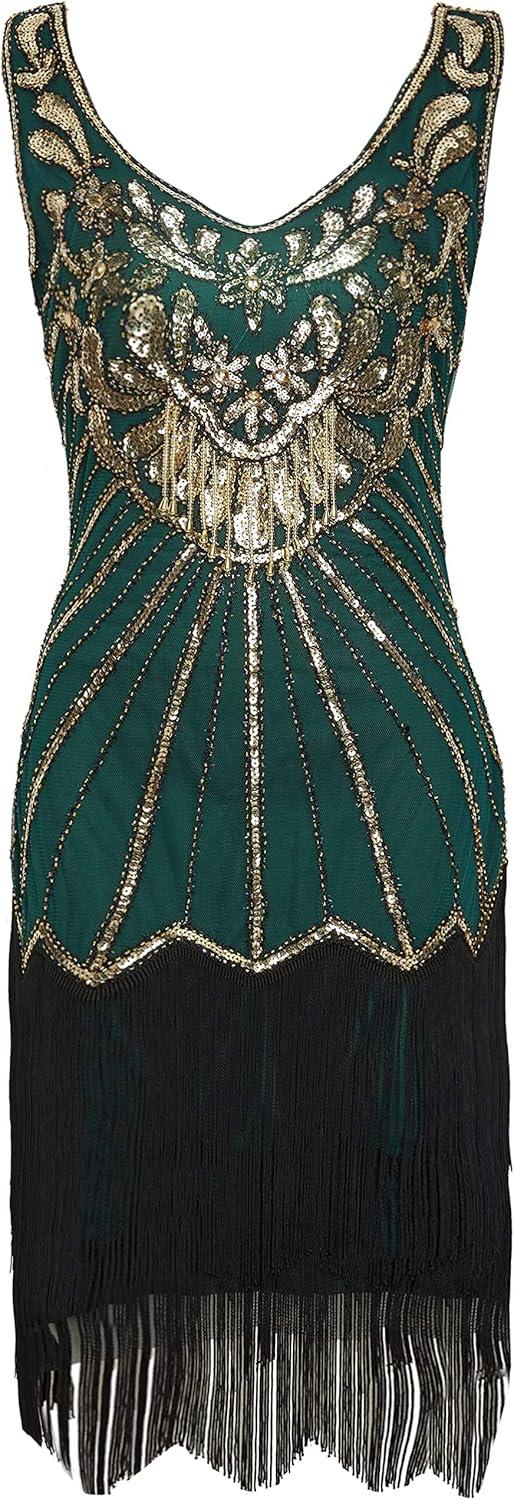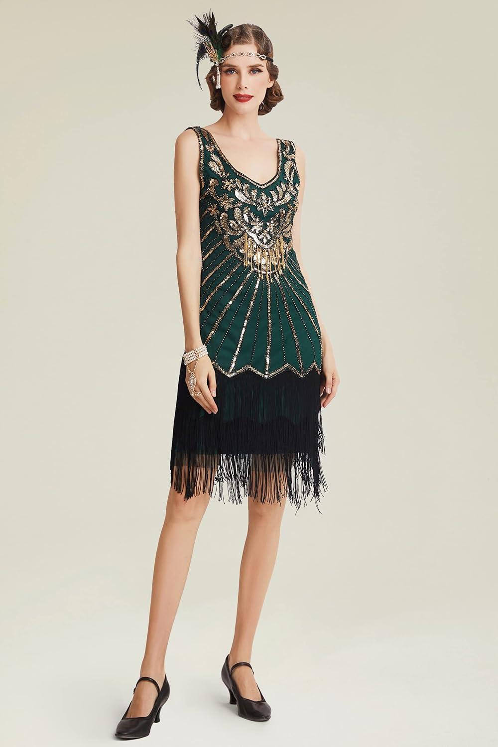 BABEYOND Women's Flapper Dresses 1920s V Neck Beaded Fringed Great Gatsby Dress(Gold Green)
