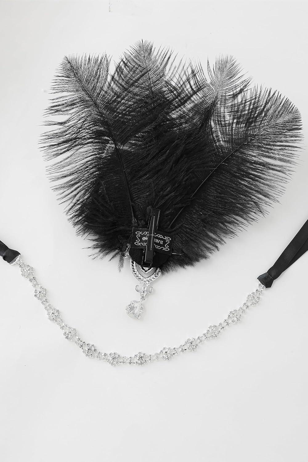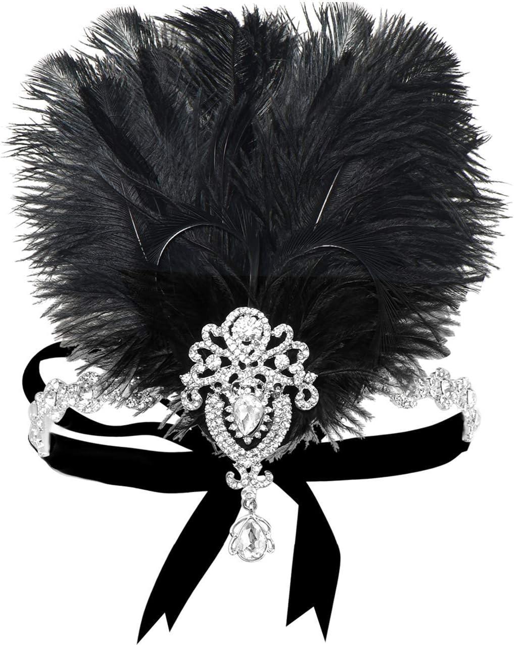 BABEYOND Women's Ostrish Feather Crystal Teal Headband Wedding Bridal Feather Headband Flapper Headpiece 1920s(Black)