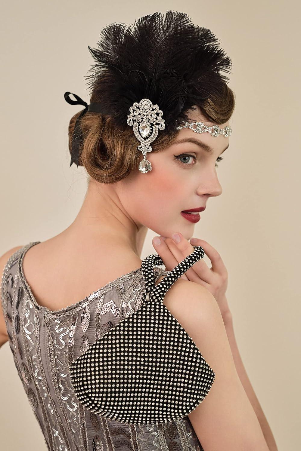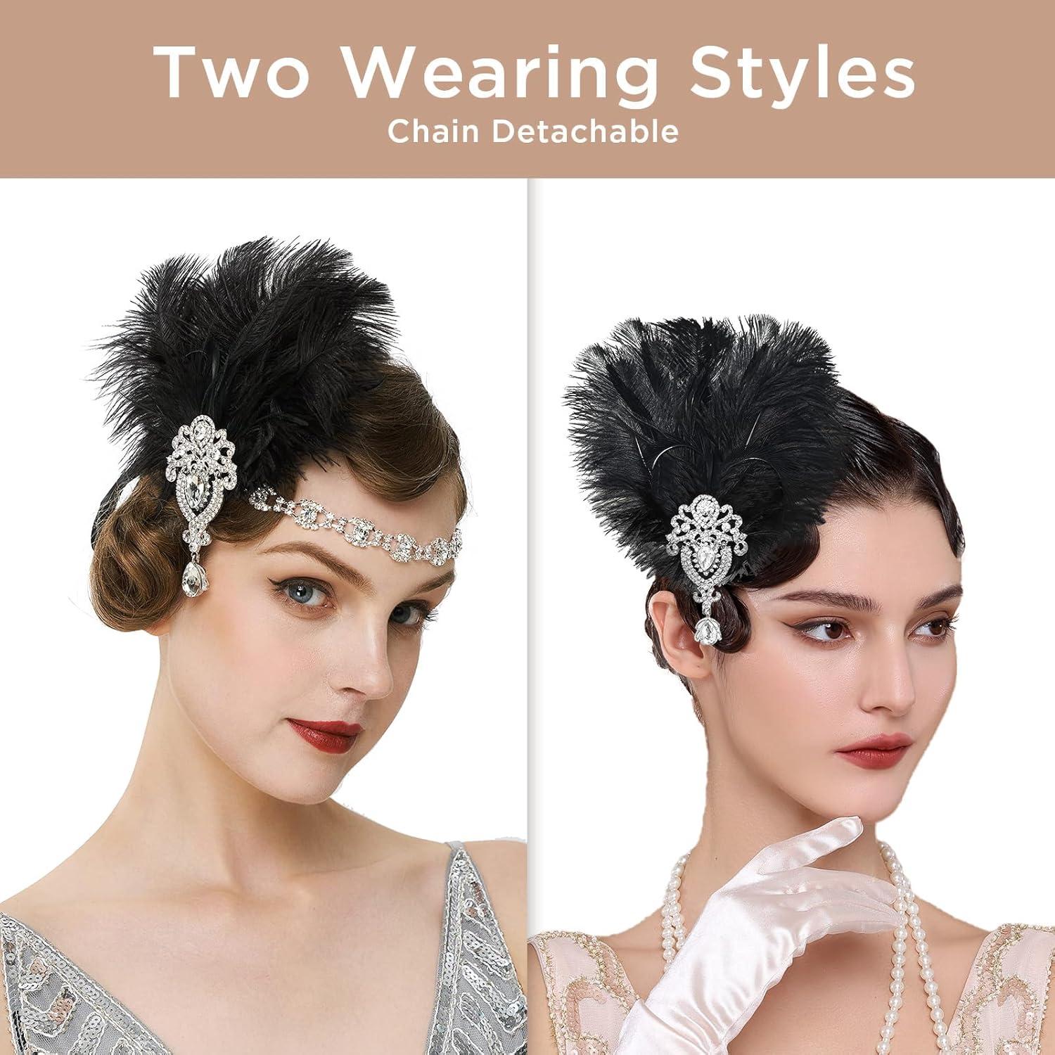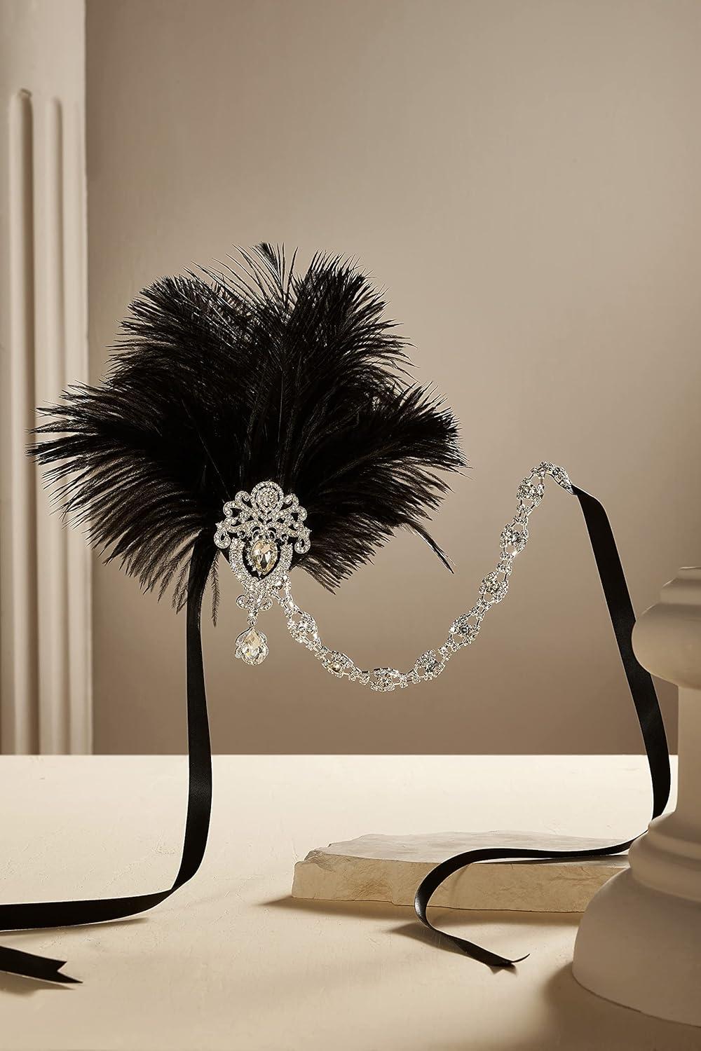 BABEYOND Women’s Ostrish Feather Crystal Teal Headband Wedding Bridal Feather Headband Flapper Headpiece 1920s(Black)