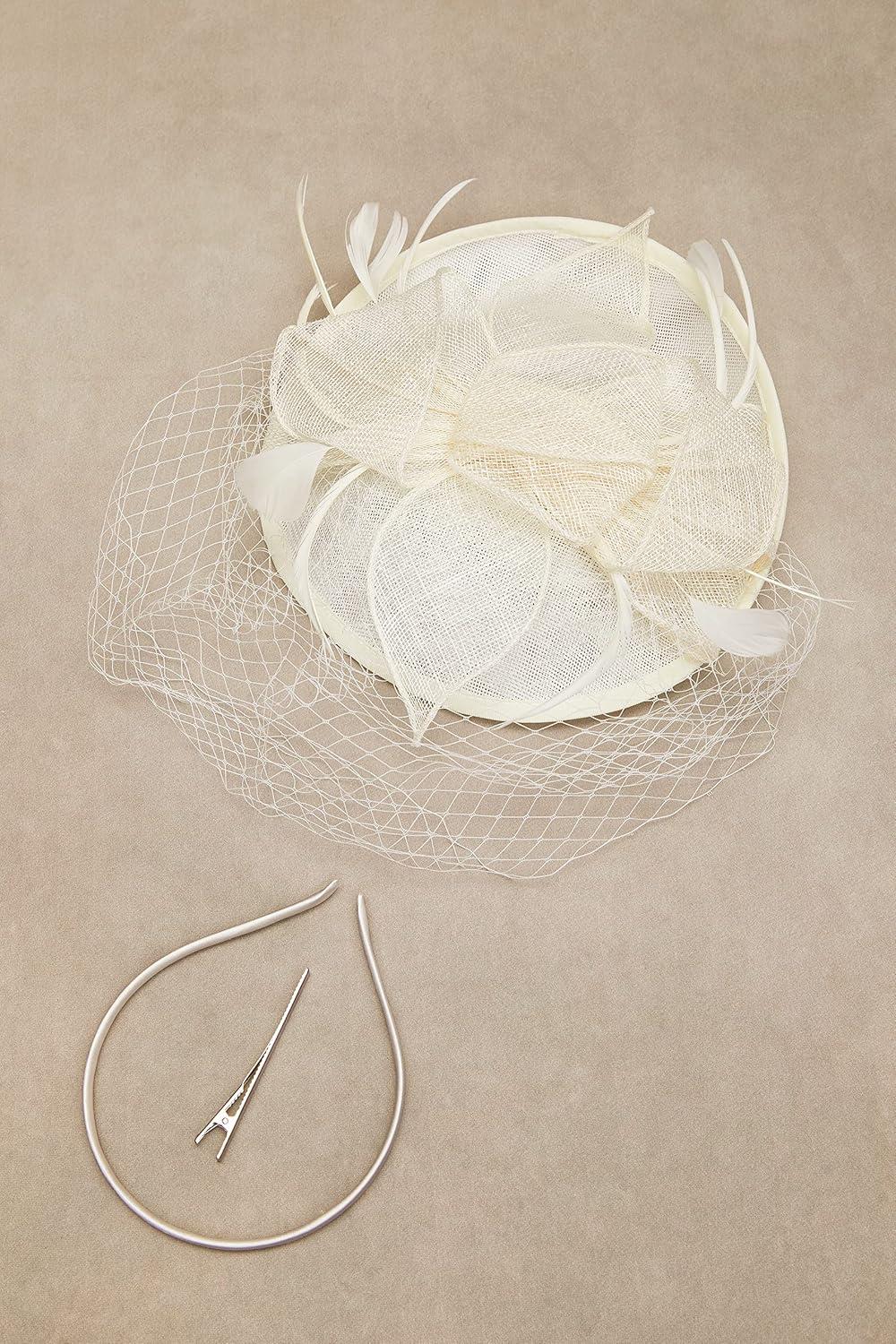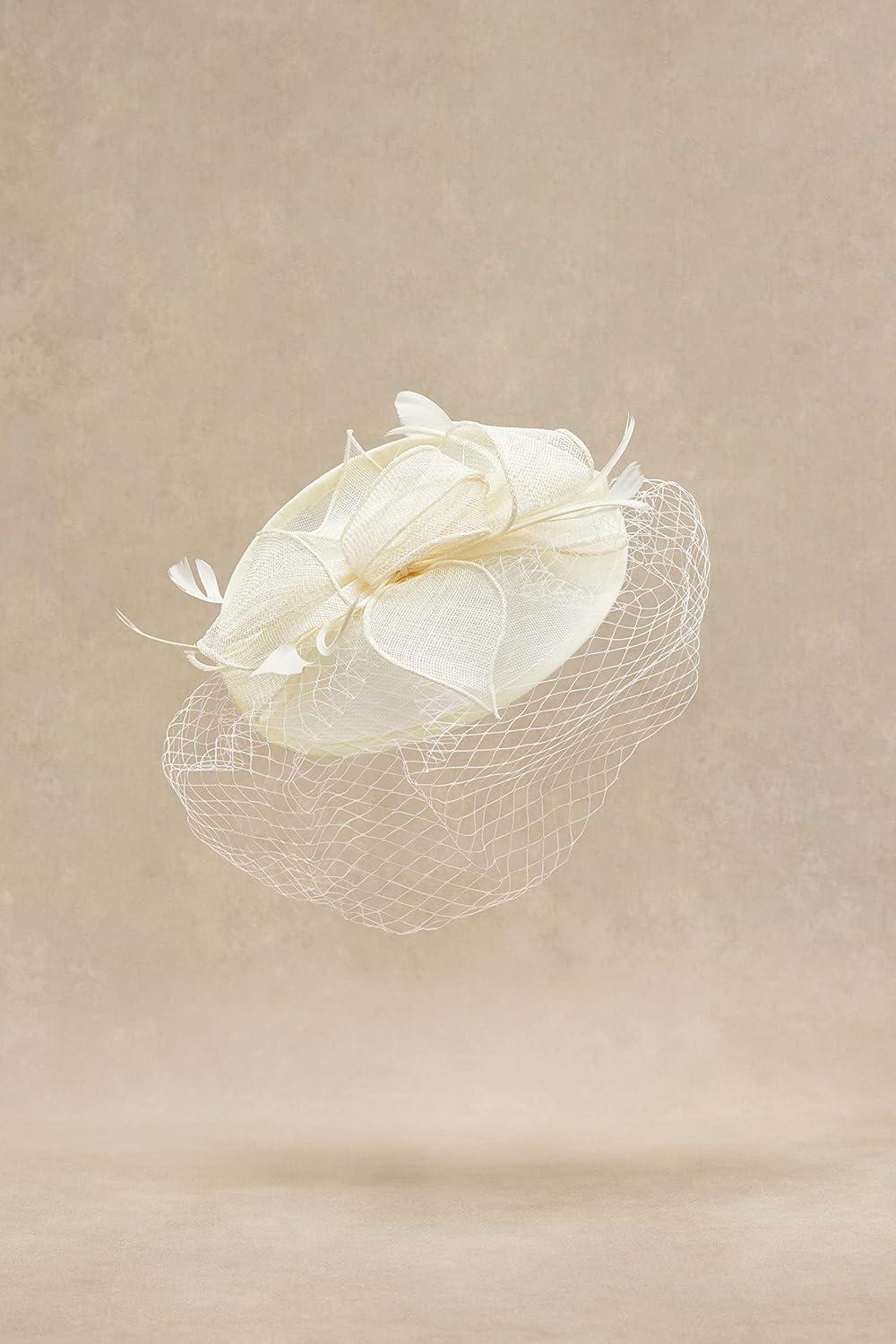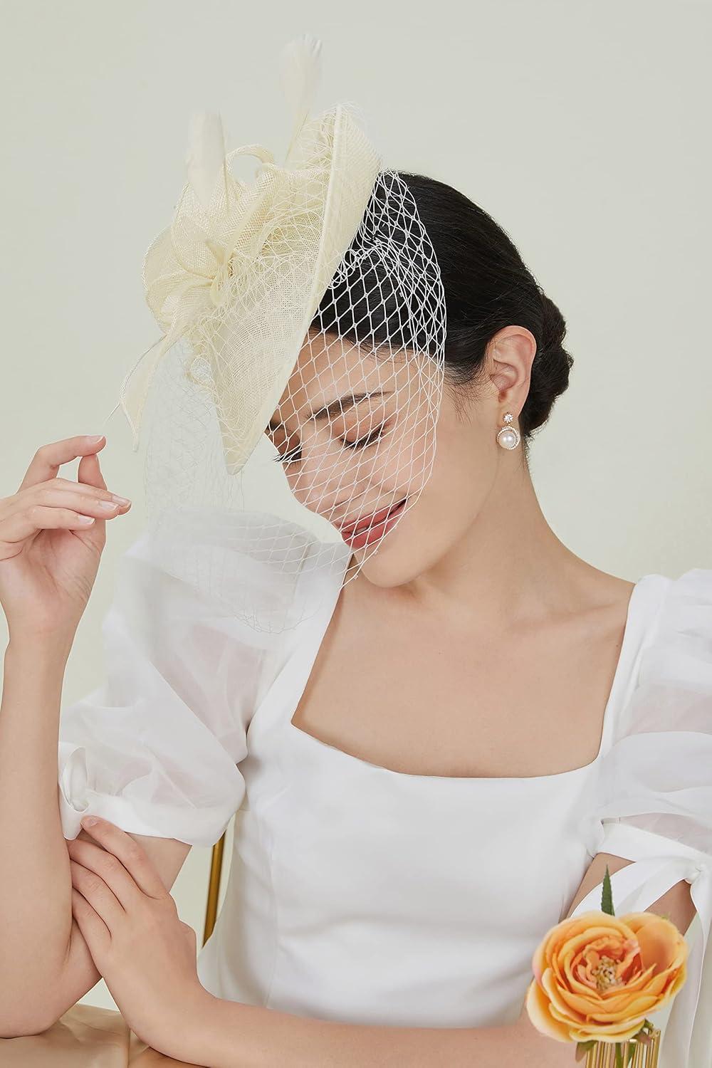 BABEYOND Women’s Pillbox Fascinator Hat Kentucky Feather Derby Tea Party Headpiece with Veil for Cocktail Costume(Off-white)
